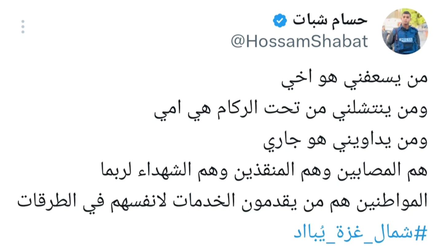 المجازر لا تتوقف في شمال غزة بدون تغطية إعلامية او غطاء طبي لعلاج المرضى مع توقف خدمة الدفاع المدني والإسعاف عن إنقاء وإجلاء المصابين The massacres do not stop in northern Gaza without media coverage or medical cover to treat patients, with the civil defense and ambulance service stopping to purify and evacuate the injured