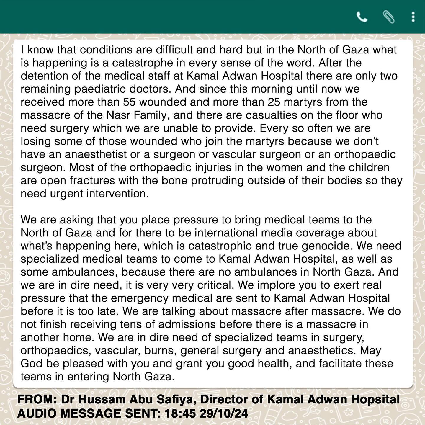 New message from Dr. Hussam Abu Safiya. Share and keep following updates of the last standing hospital in the North. Dr. Hussam is going above and beyond to continue calling for medical supplies and resources to be allowed in. It is only him and pediatrician remaining at Kamal Adwan Hospital with a lack of resources to provide care for surgical patients. @dr.hussam73