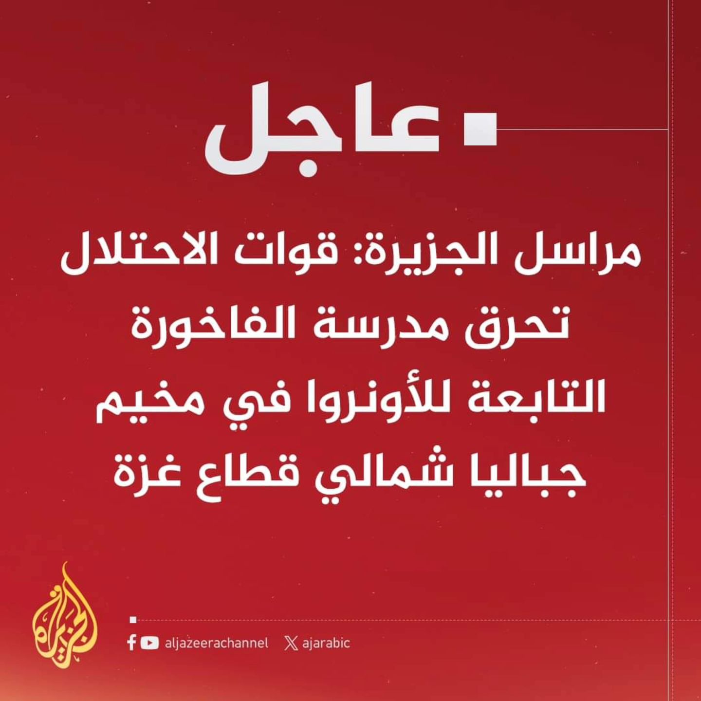 #عاجل | مراسل #الجزيرة: قوات الاحتلال تحرق مدرسة الفاخورة التابعة للأونروا في مخيم جباليا شمالي قطاع غزة