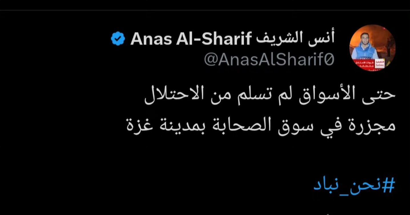 استهدفت طائرات الاحتلال تجمعاً للمواطنين بسوق الصحابة وسط مدينة غزة بصاروخين من طائرة استطلاع لمكان مأهول بالباعة و المتسوقين ، اربعة شهداء و عشرات الاصابات تم نقلها من المكان لمستشفى المعمداني The occupation planes targeted a gathering of citizens in the Sahaba market in the center of Gaza City with two rockets from a reconnaissance plane for a place inhabited by vendors and shoppers, four martyrs and dozens of injuries were transferred from the place to Al-Madani Hospital