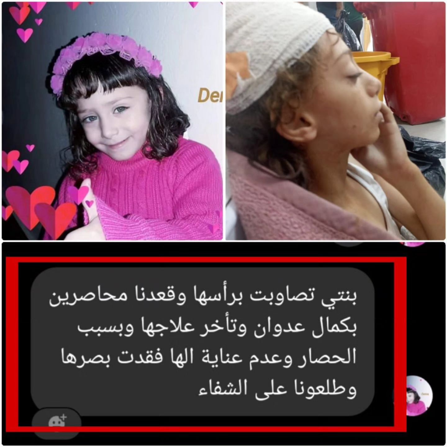 مناشدة من عائلة الطفلة ديما سامح سرور للسماح بسفرها لتلقي العلاج بعد أن فقدت بصرها جراء إصابتها في رأسها خلال حصار قوات الاحتلال الإسرائيلي لمستشفى كمال عدوان شمال قطاع غزة.