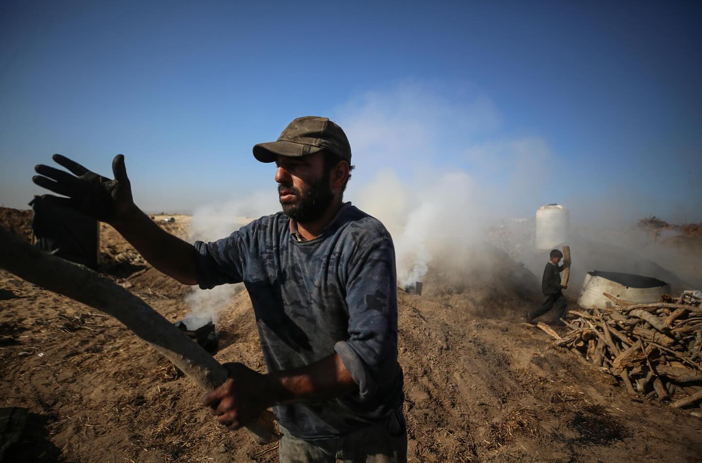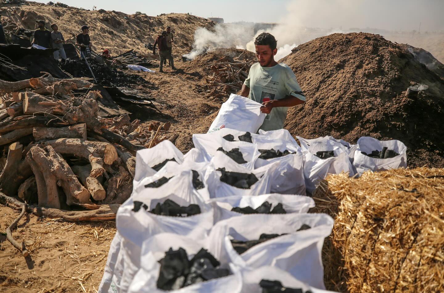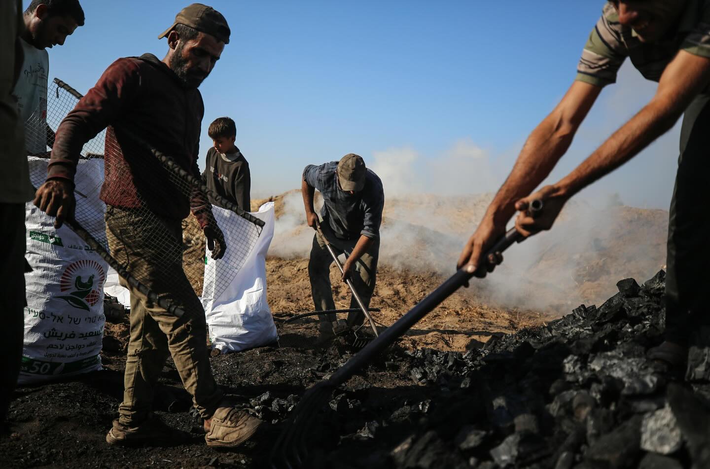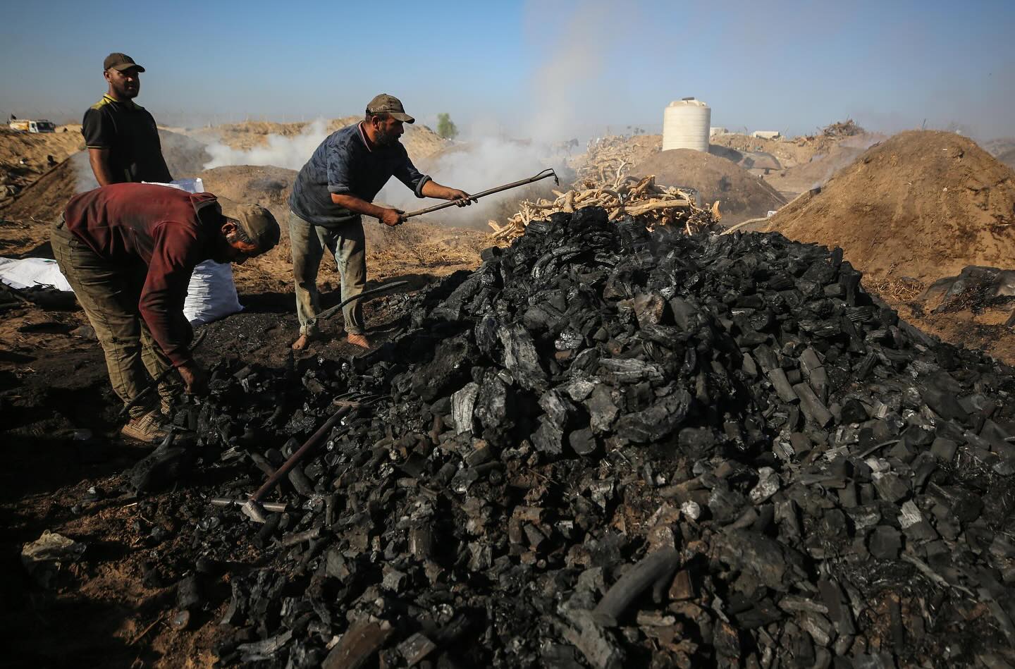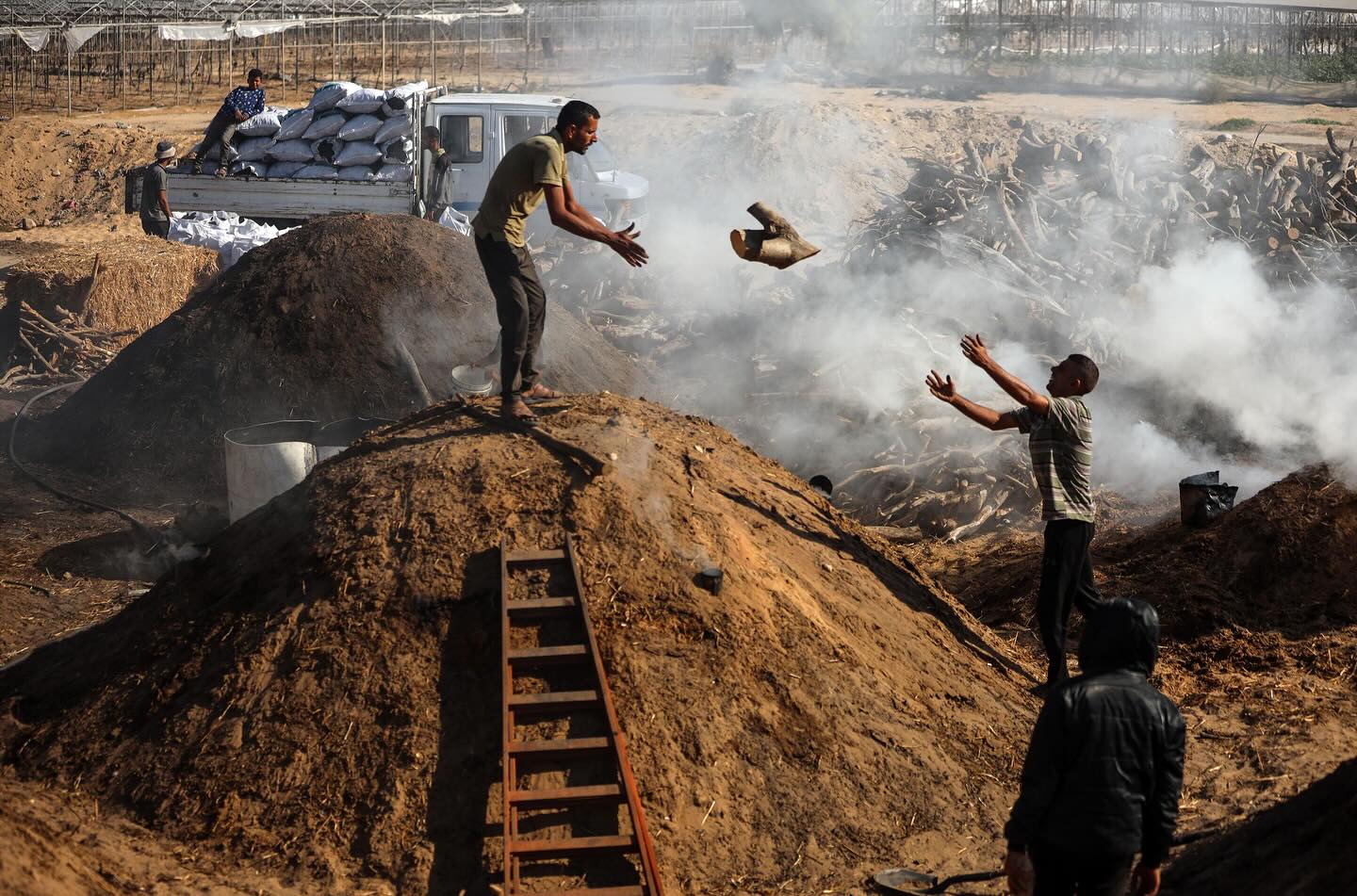 Palestinians work at a coal production facility in Khan Younis, southern Gaza Strip, on October 30, 2024, photo by majdi fathi