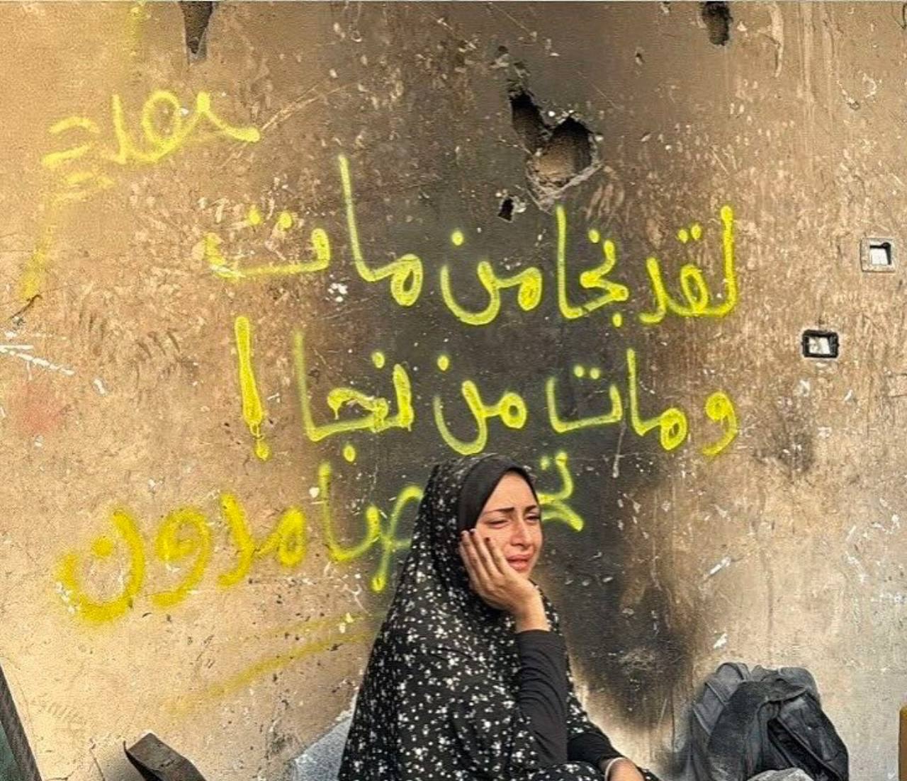 A bereaved Palestinian woman in #Gaza sitting in front of graffiti that reads: “Those who died survived and those who survived died.” "لقد نجا من مات، و مات من نجا" .. لسان حال اهل غزة اليوم