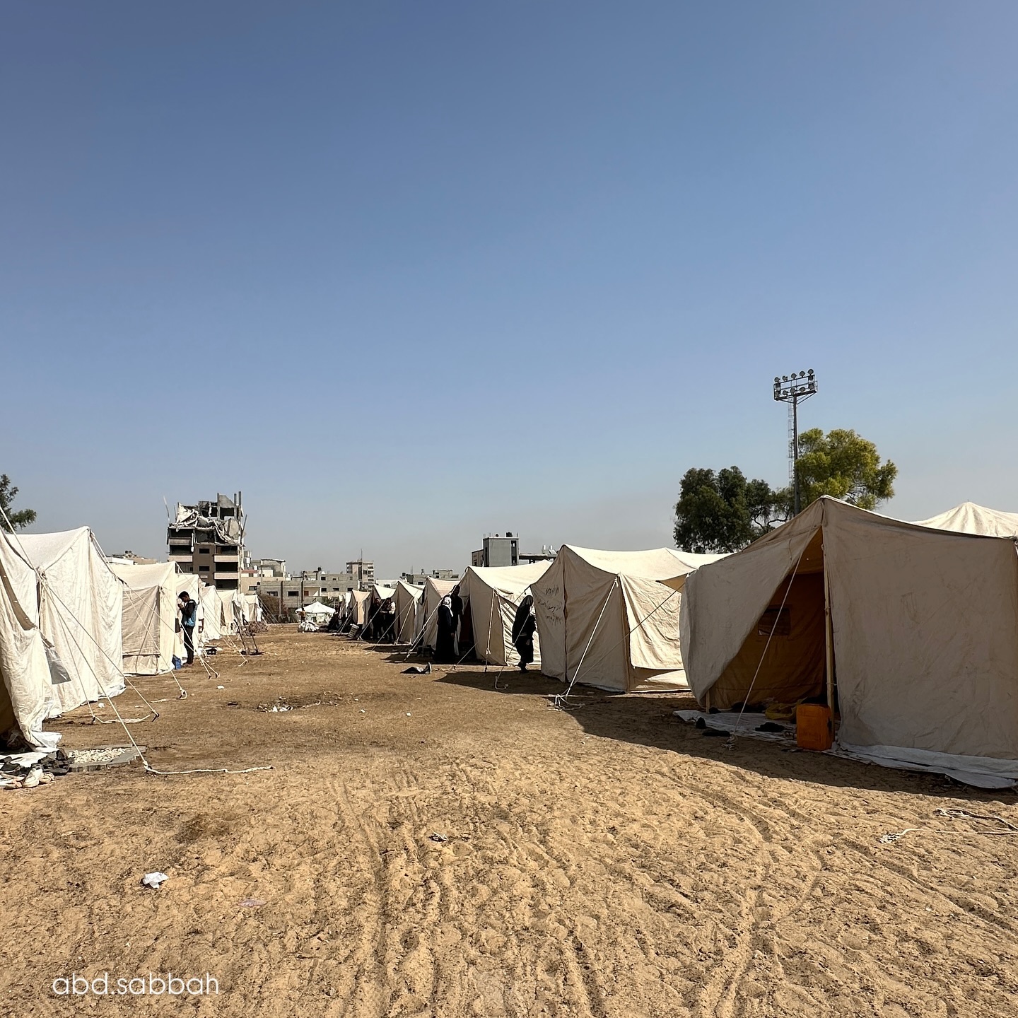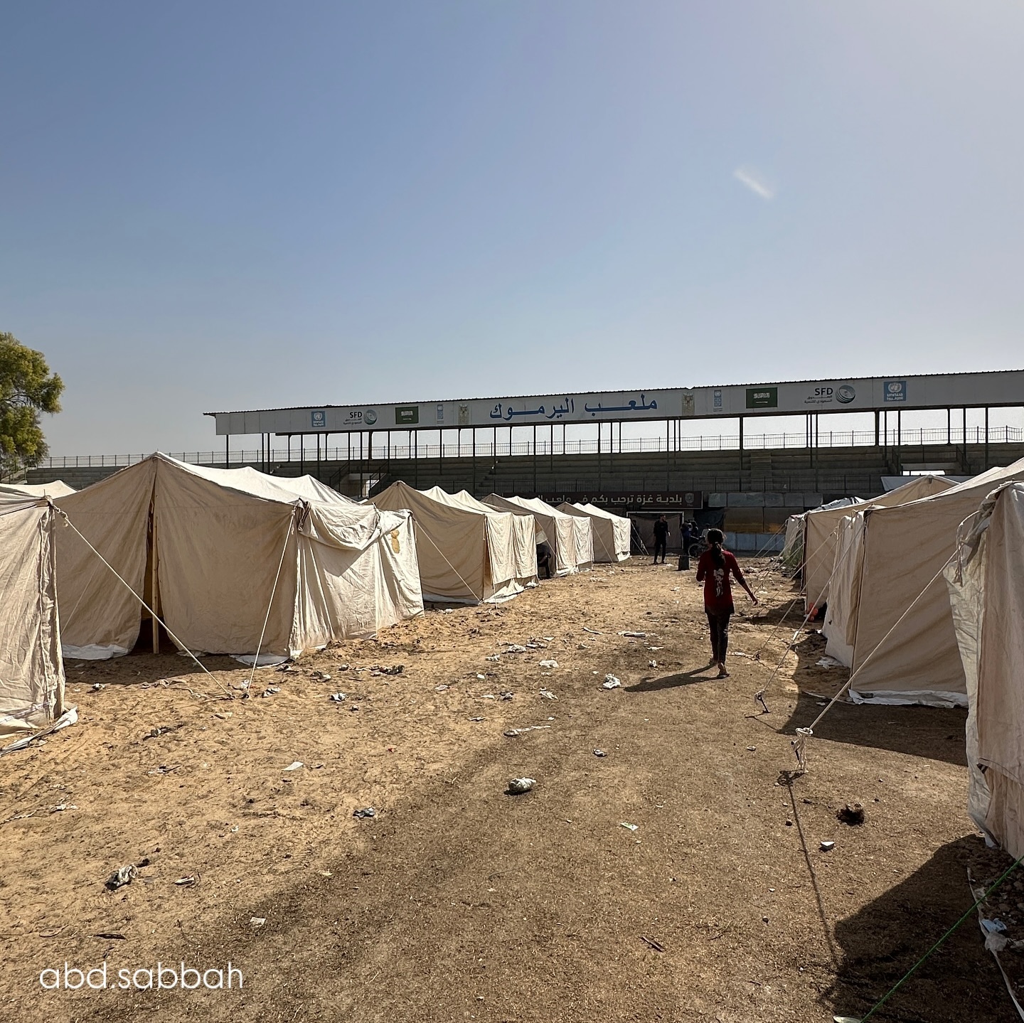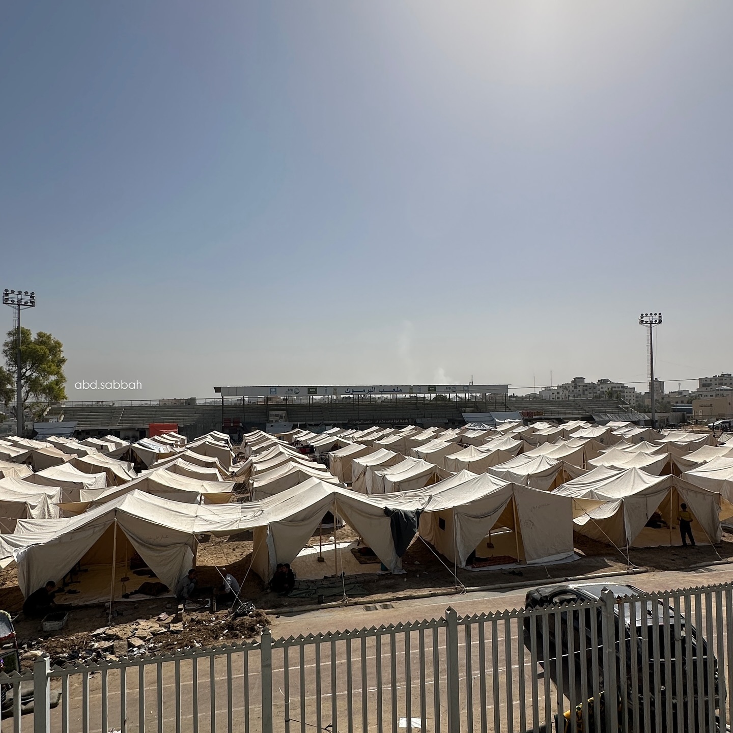 ملعب اليرموك تحول من ملعب رياضي لمركز إيواء للنازحين من شمال غزة ومدينة غزة نظراً لإكتظاظ مراكز الإيواء بالنازحين Yarmouk Stadium was converted from a sports stadium to a shelter center for the displaced from northern Gaza and Gaza City due to the overcrowding of the shelters with the displaced #شمال_غزة_يجوع #شمال_غزة_يباد