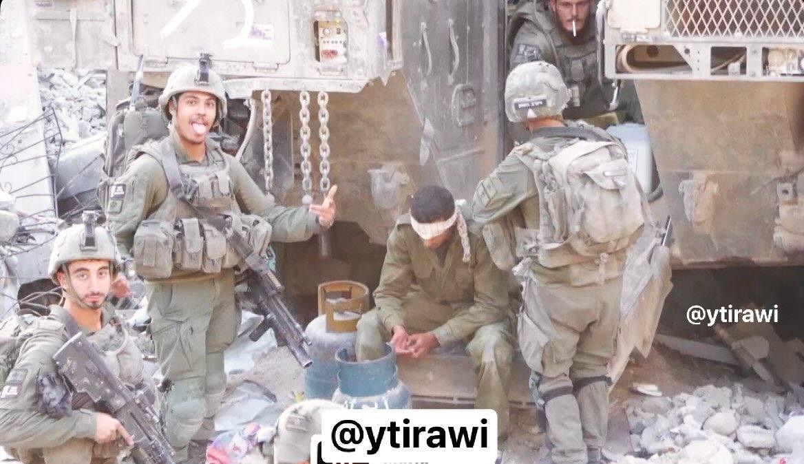 An Israeli soldier published this photo of a Palestinian who was detained in Jabalia refugee camp, north of Gaza, and forced to wear an military uniform to use as a human shield.