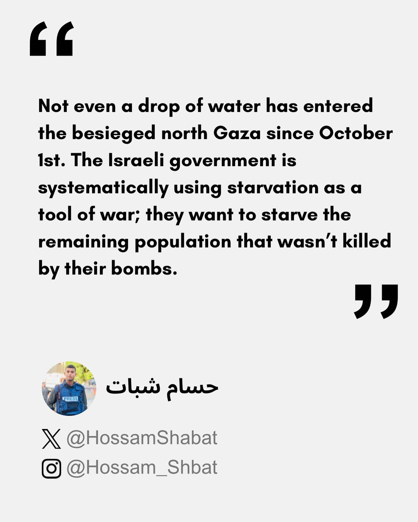Not even a drop of water has entered the besieged north Gaza since October 1st. The Israeli government is systematically using starvation as a tool of war; they want to starve the remaining population that wasn’t killed by their bombs.