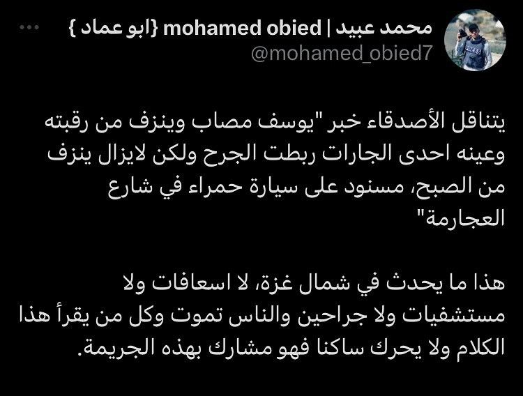 أتدرون معنى العجز؟ إنه ما نعيشه الآن في شمال غزة.. لا ملجأ لنا ولا منجى إلا إليك يا الله. كل لحظة تصلني عشرات المناشدات من عائلات محاصرة، دُمرت منازلهم فوق رؤوسهم، ولم أعد أستطيع حتى إحصاءها. لا أملك لهم سوى نشر مناشداتهم، على أمل أن تجد صدى، رغم علمي بأنها، للأسف، بلا جدوى في عالم لا يرى موتنا شيئاً مهماً. قلبي يعتصر ألماً على هذه العائلات المنكوبة، تُقتلها إسرائيل بلا رحمة، صغيرهم قبل كبيرهم، فقط لأنهم فلسطينيون..!