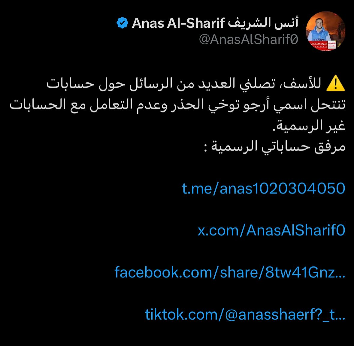 ⚠️ للأسف، تصلني العديد من الرسائل حول حسابات تنتحل اسمي أرجو توخي الحذر وعدم التعامل مع الحسابات غير الرسمية. مرفق حساباتي الرسمية : https://t.me/anas1020304050 https://x.com/AnasAlSharif0 https://www.facebook.com/share/8tw41Gnz1RwQkEZc/ https://www.tiktok.com/@anasshaerf?_t=8qxQWRVffwF&_r=1