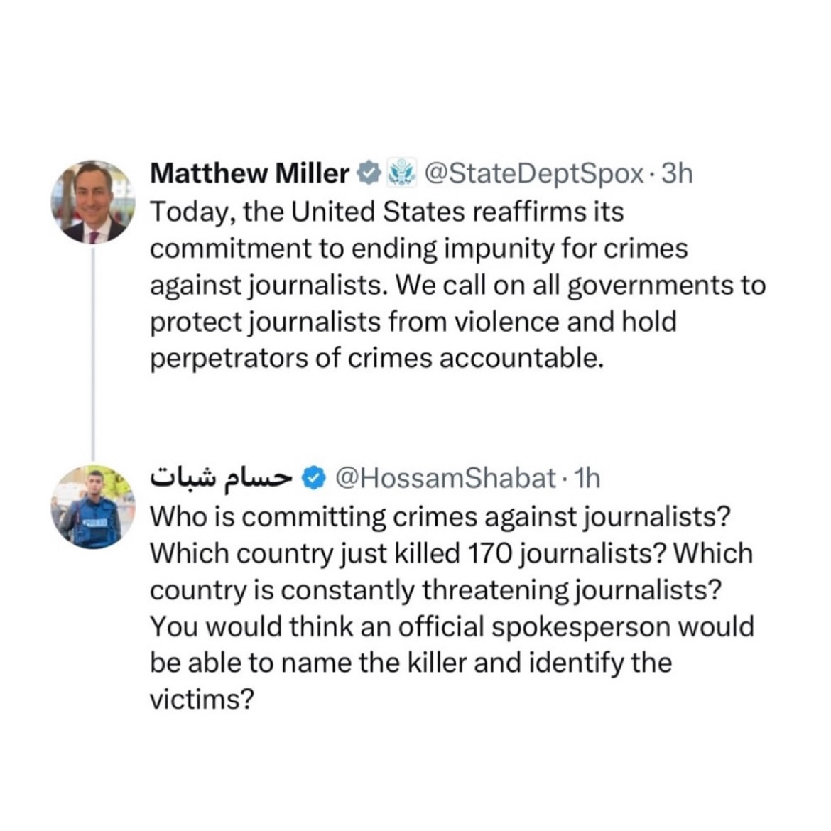 4:28 PM @hossam_shbat They have ki||ed paramedics, journalists, doctors, teachers, engineers, farmers, fishermen, shop owners, construction workers, artists, women, men, and children — they have destroyed every aspect of our society. They have ki||ed everything and everyone without any accountability. The occupation's violence knows no bounds, sparing no one, from those who save lives to those who build, plant, teach, and nurture. This relentless aggression has left nothing without destruction, and every profession, every life, has been claimed by it.
