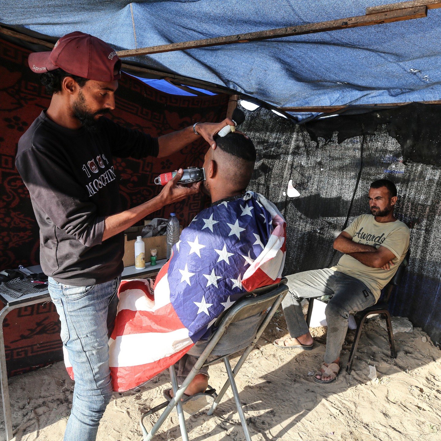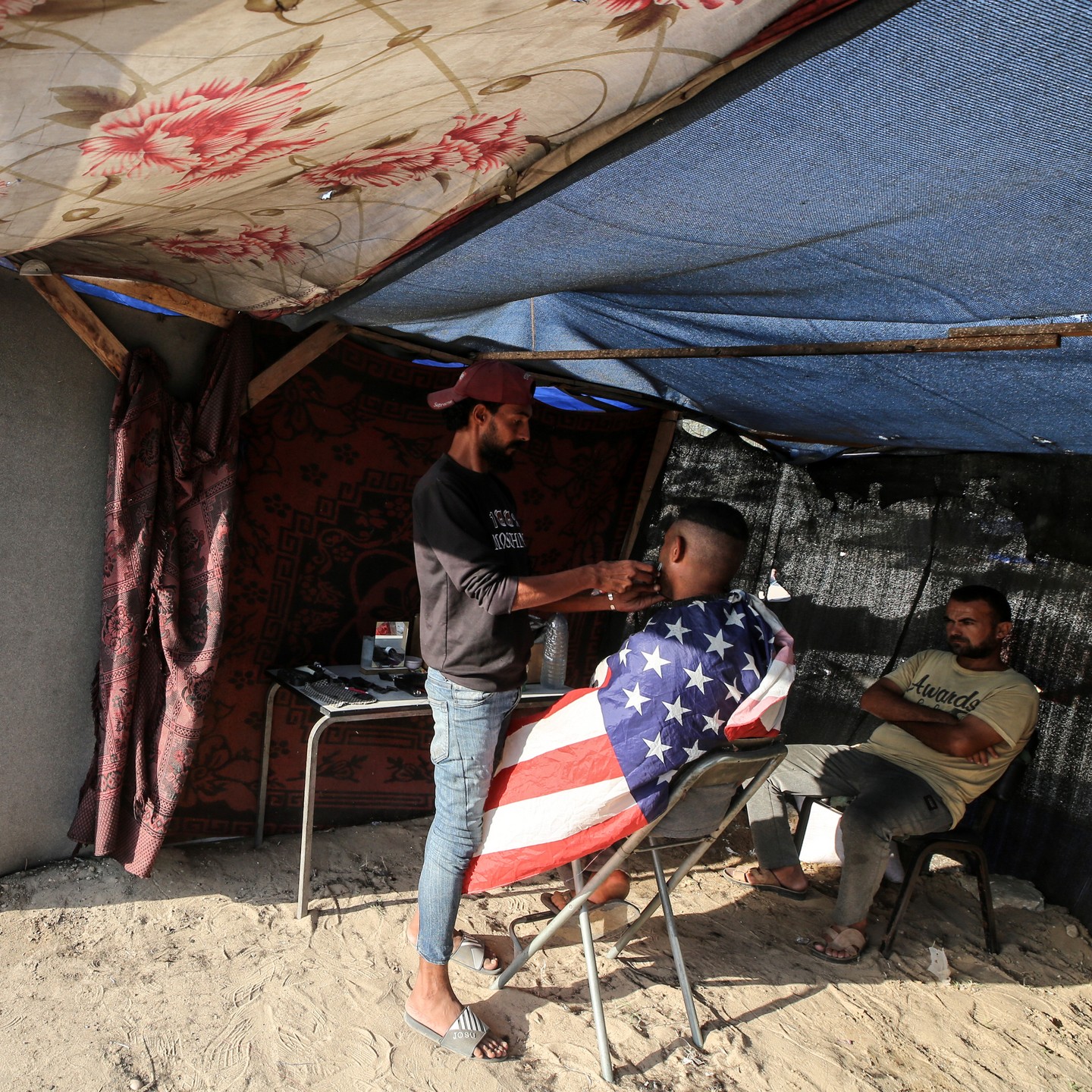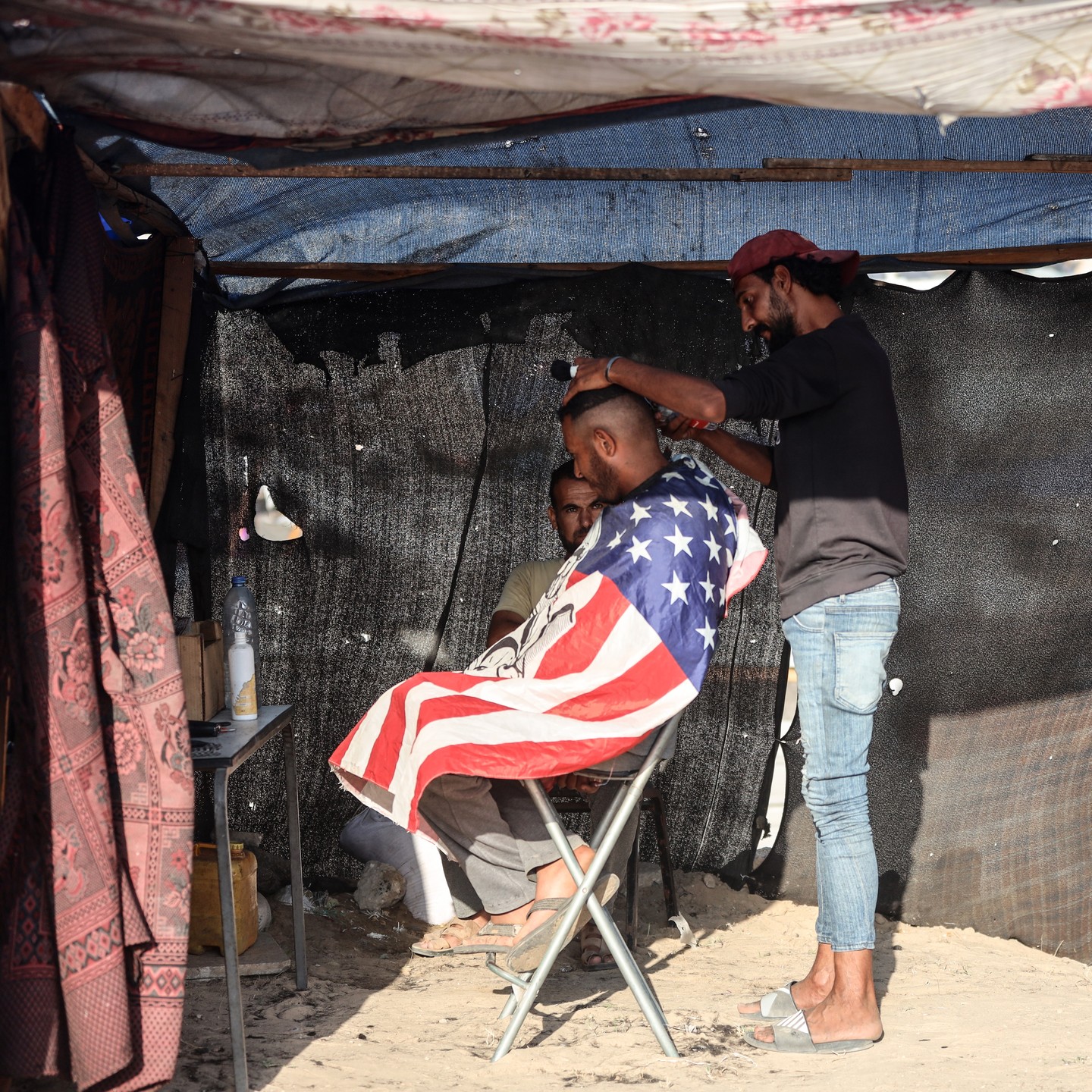 A Palestinian barber trims a customer’s beard inside a tent, using the American flag as a cape, on the side of the road in Khan Younis in the southern Gaza Strip November 6, 2024, photo by majdi fathi