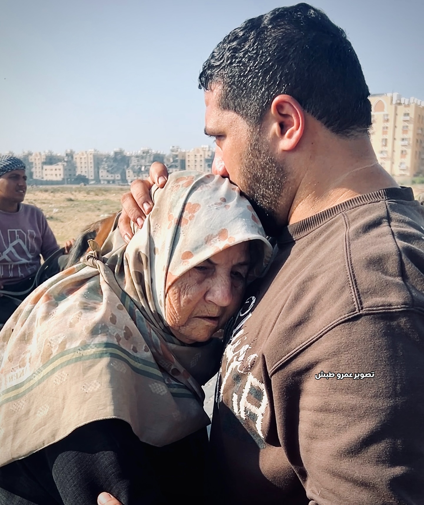 شاب يحتضن والدته التي كانت تبكي بقهر هلى نزوحها عشرات المرات وتعبها بسبب القصف الاسرائيلي المتواصل على المناطق الجنوبية لقطاع غزة A young man hugs his mother who was crying in grief after being displaced dozens of times and exhausted by the ongoing Israeli bombardment of the southern areas of the Gaza Strip.