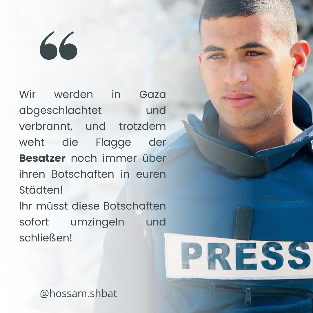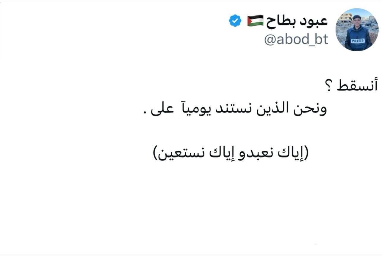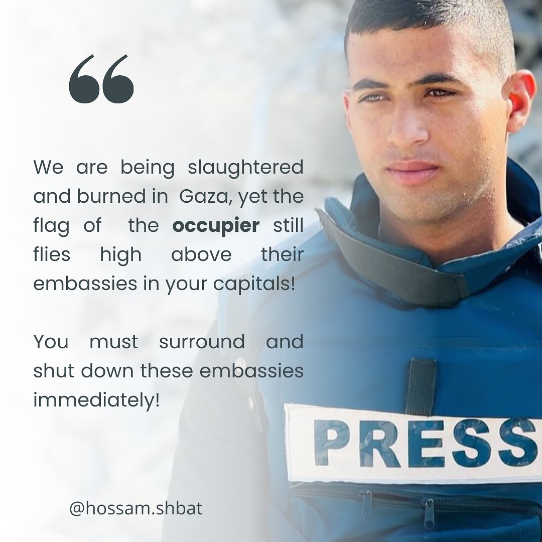 اليوم أكملت 33 عاماً أعيش هنا في غزة، وسط ذكريات الحرب التي أصبحت جزءاً من حياتي اليومية. في عامها الثاني الآن، فقدت خلالها الكثير من الأهل والأصدقاء، وفقدت أيضاً أجزاءً مني معهم. ومع ذلك، أستمر في طريقي، ممسكاً بقلمي وعدستي، محاولاً إيصال صوت من لا يُسمع، وكشف الحقيقة للعالم. في هذا اليوم، أكثر ما أحتاجه هو الإيمان بأننا نستحق السلام، وأننا نستحق أن نحيا بكرامة وأمان. Today I completed 33 years I live here in Gaza, amid memories of the war that has become part of my daily life. In her second year now, she lost a lot of family and friends, and she also lost parts of me with them. However, I continue on my way, holding my pen and lens, trying to convey the voice of those who do not hear, and reveal the truth to the world. On this day, what I need most is the belief that we deserve peace, and that we deserve to live with dignity and security.