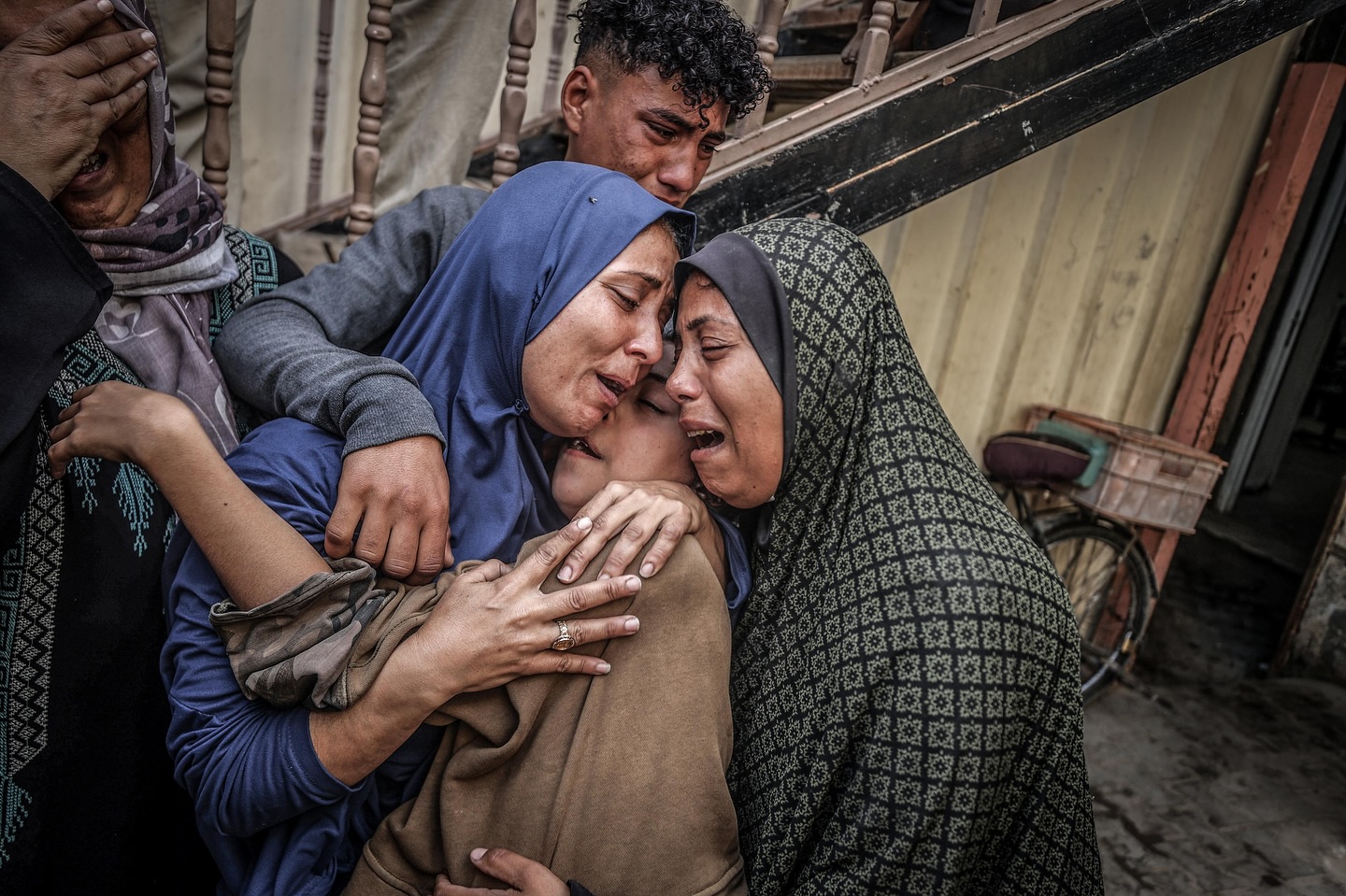 Relatives of Palestinians, who lost their lives due to Israeli attacks, mourn as they receive the bodies from morgue of al-Aqsa Martyrs Hospital for funeral process in Deir al-Balah, Gaza. (Photo by Ali Jadallah/Anadolu via Getty Images)