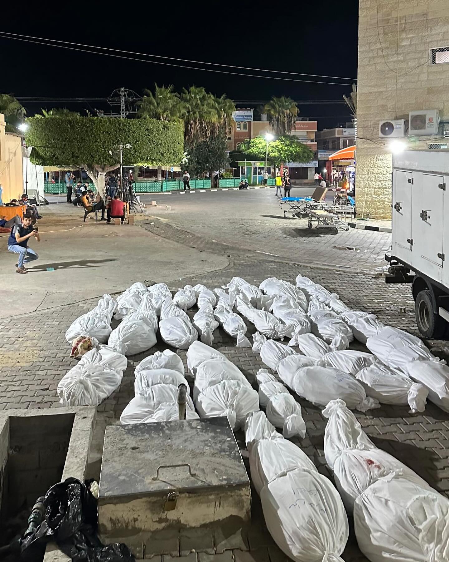 استهداف مجموعة من المواطنين داخل سوق عمر المختار بجوار المستشفى المعمداني بمدينة غزة. Targeting a group of citizens inside the Omar Al-Mukhtar market next to the Baptist Hospital in Gaza City.