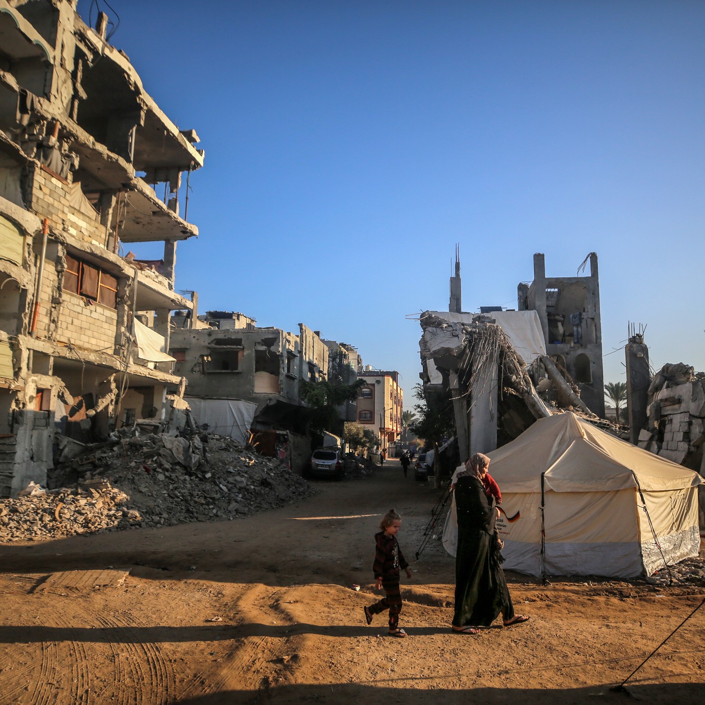 A #Palestinian #woman #carries a #child as they #walk past the #rubble of #houses #destroyed in previous strikes during the #Israeli #military offensive, in Deir el-Balah in the central #Gaza Strip on November 13, 2024, #photo by majdi fathi