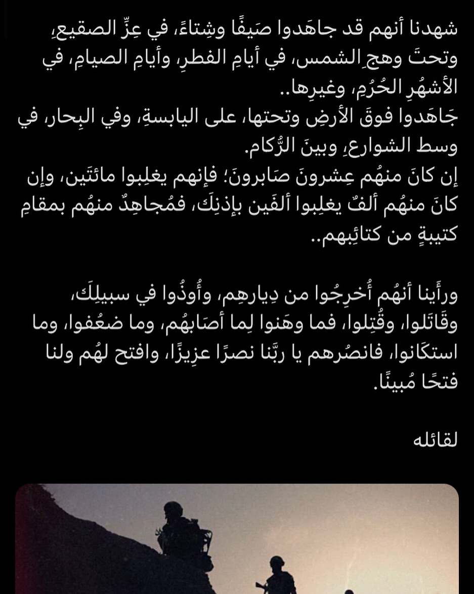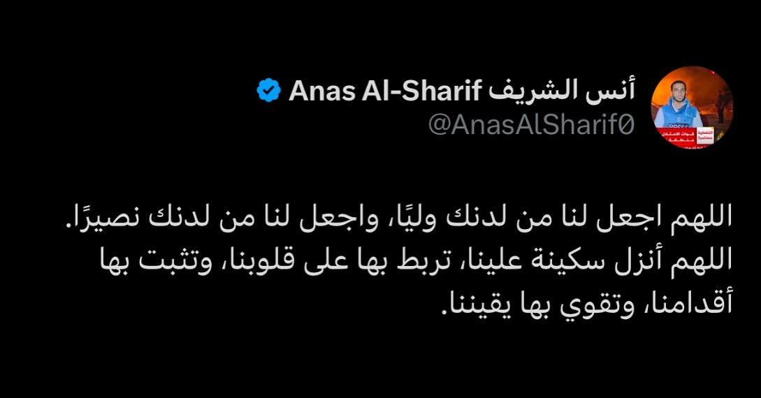 ورأَينا أنهُم أُخرِجُوا من دِيارهِم، وأُوذُوا في سبيلِكَ، وقَاتَلوا، وقُتِلوا، فما وهَنوا لِما أصَابهُم، وما ضعُفوا، وما استكَانوا، فانصُرهم يا ربَّنا نصرًا عزِيزًا، وافتح لهُم ولنا فتحًا مُبينًا.