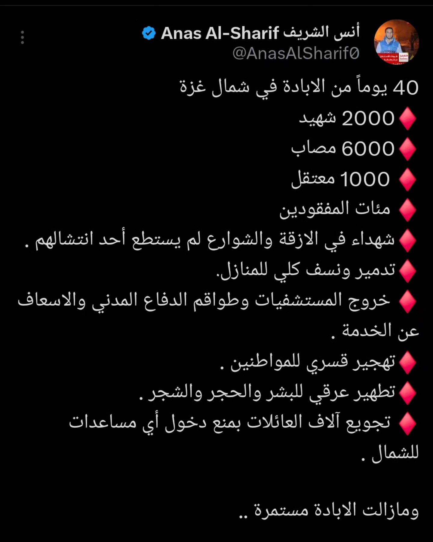 40 يوماً من الابادة في شمال غزة ♦️2000 شهيد ♦️6000 مصاب ♦️ 1000 معتقل ♦️ مئات المفقودين ♦️شهداء في الازقة والشوارع لم يستطع أحد انتشالهم . ♦️تدمير ونسف كلي للمنازل. ♦️ خروج المستشفيات وطواقم الدفاع المدني والاسعاف عن الخدمة . ♦️تهجير قسري للمواطنين . ♦️تطهير عرقي للبشر والحجر والشجر . ♦️ تجويع آلاف العائلات بمنع دخول أي مساعدات للشمال . ومازالت الابادة مستمرة .. 🎙 #أنس_الشريف #شمال_غزة_يُباد