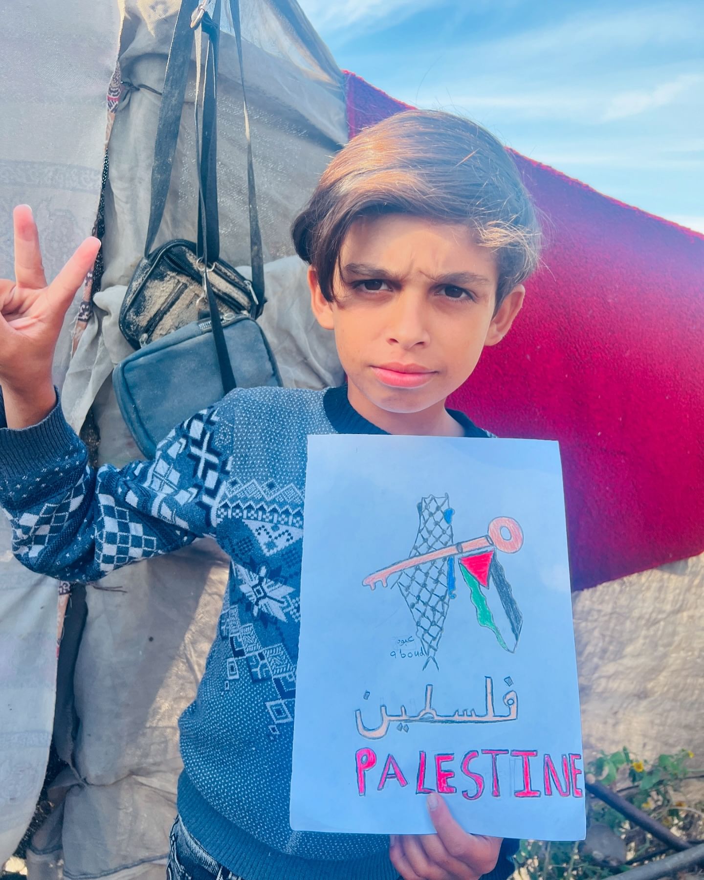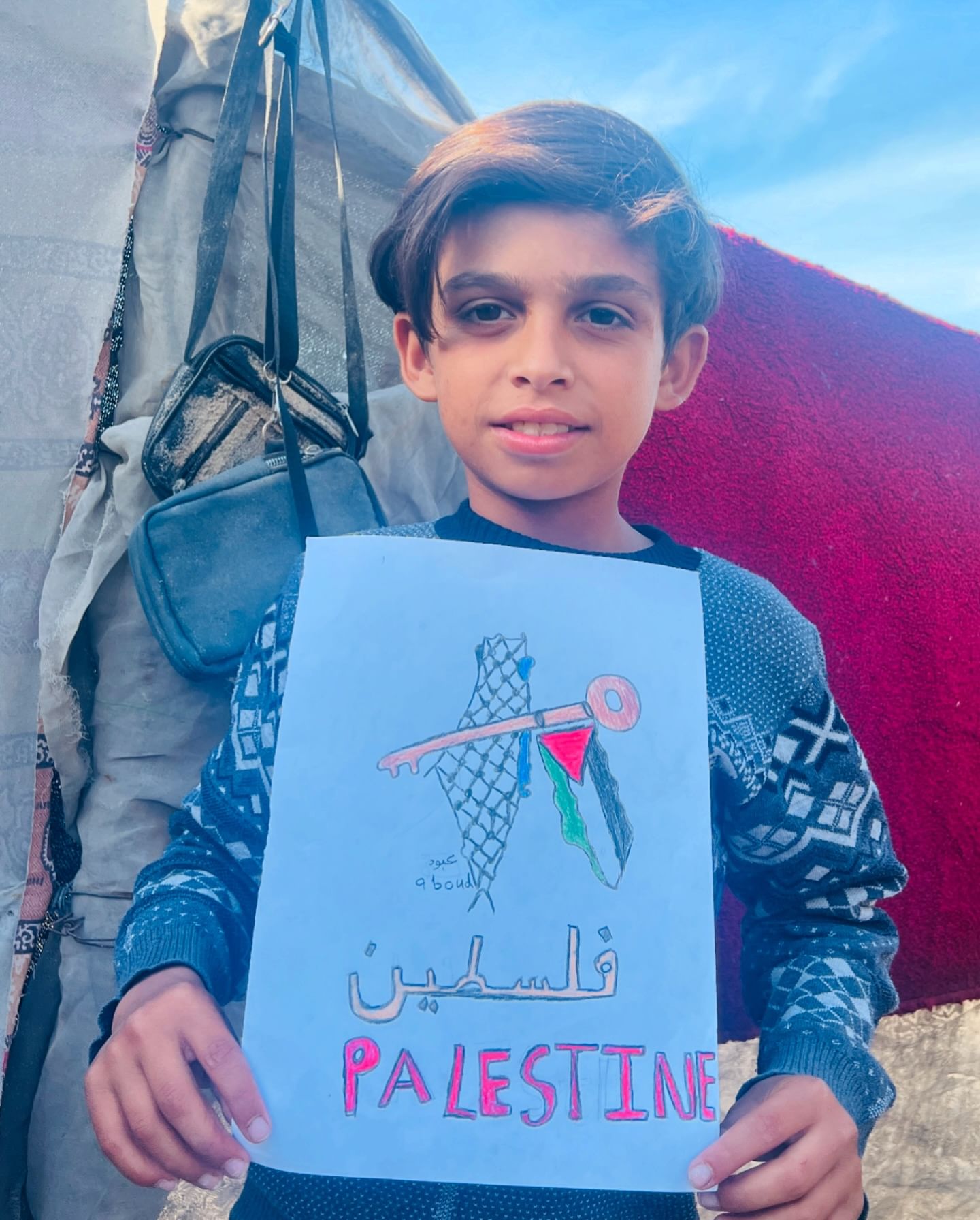 طفل فلسطيني يدعو الله أن يمده بالقوة التي تعينه على حمل دلوين من الماء وتوصيلهما إلى أهله النازحين في قطاع غزة. A Palestinian child prays to God to grant him the strength to carry two buckets of water and deliver them to his displaced family in Gaza.
