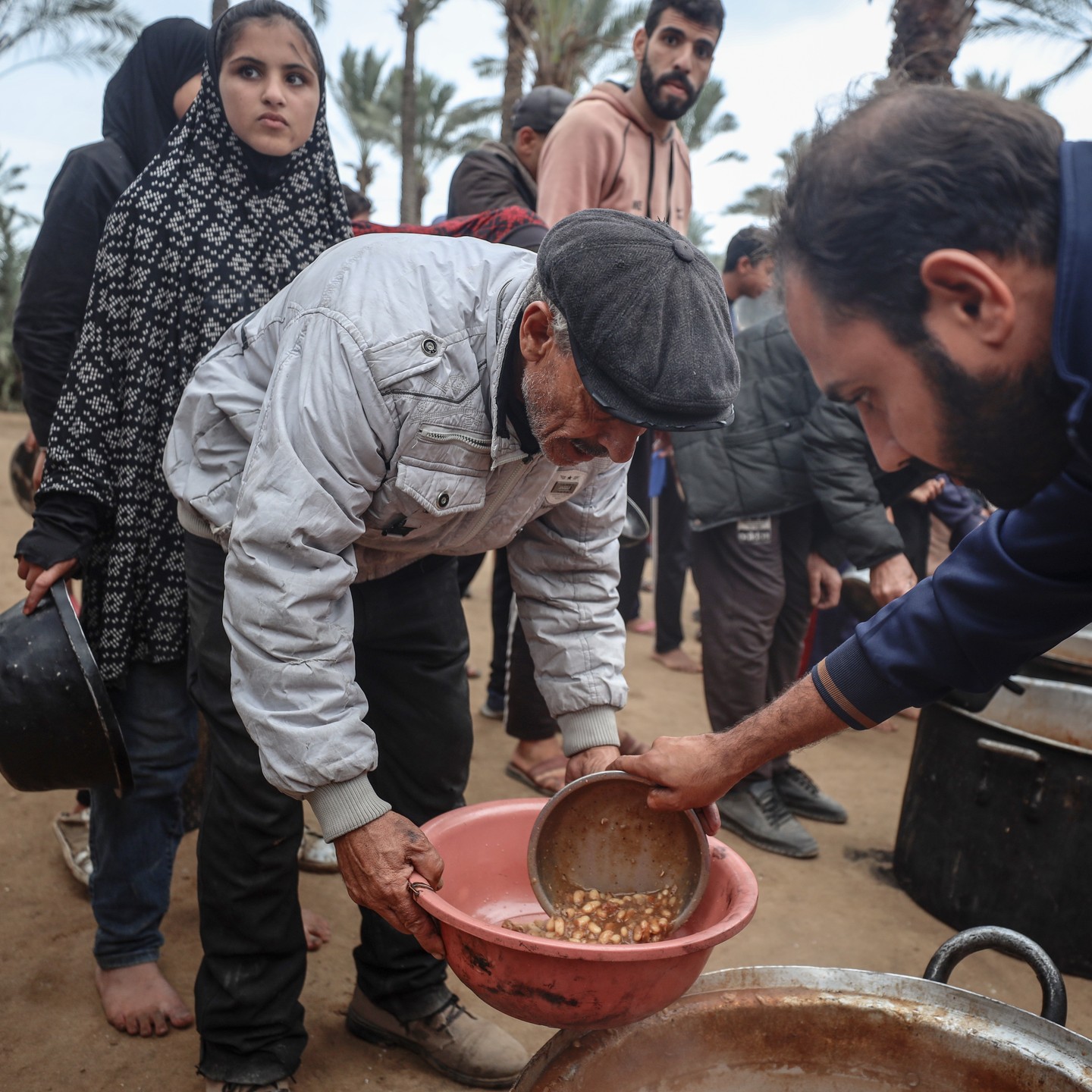 Displaced Palestinian receive a hot meal in Deir al-Balah, central Gaza Strip, on November 24, 2024, photo by majdi fathi