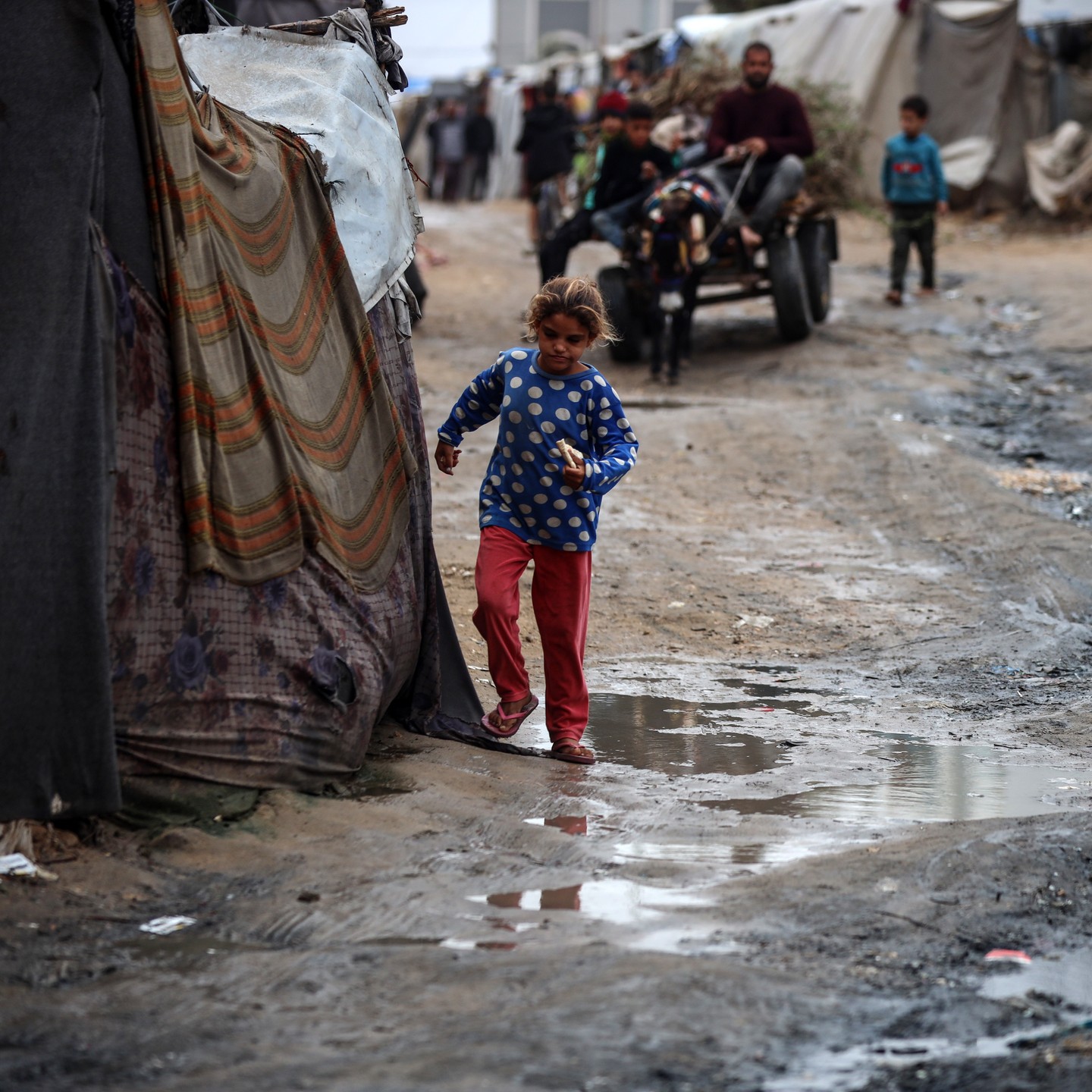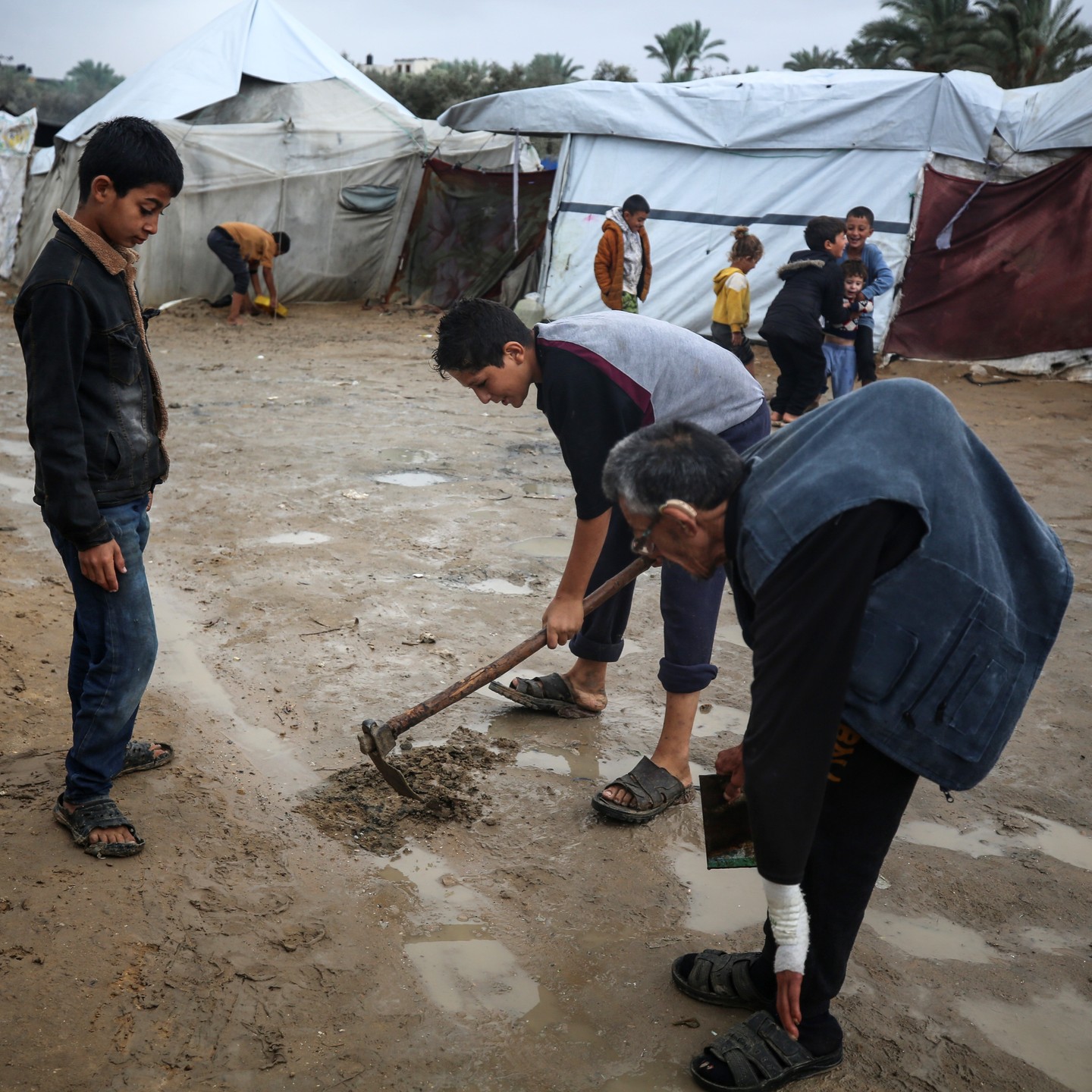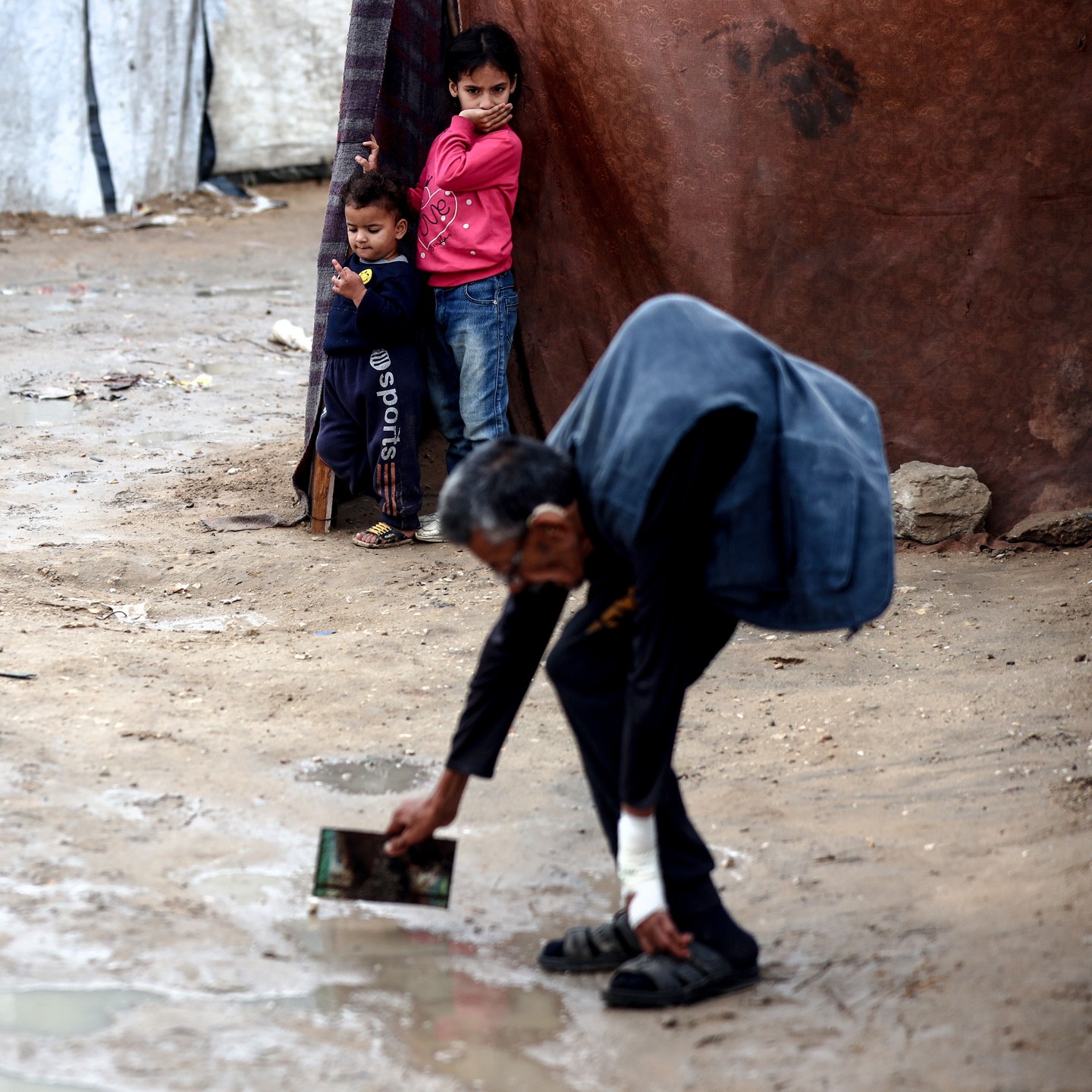 Displaced Palestinian children wait under the rain to provide water for their families in Gaza. أطفال ينتظرون تحت الأمطار للحصول على المياه لعائلاتهم النازحة في غزة