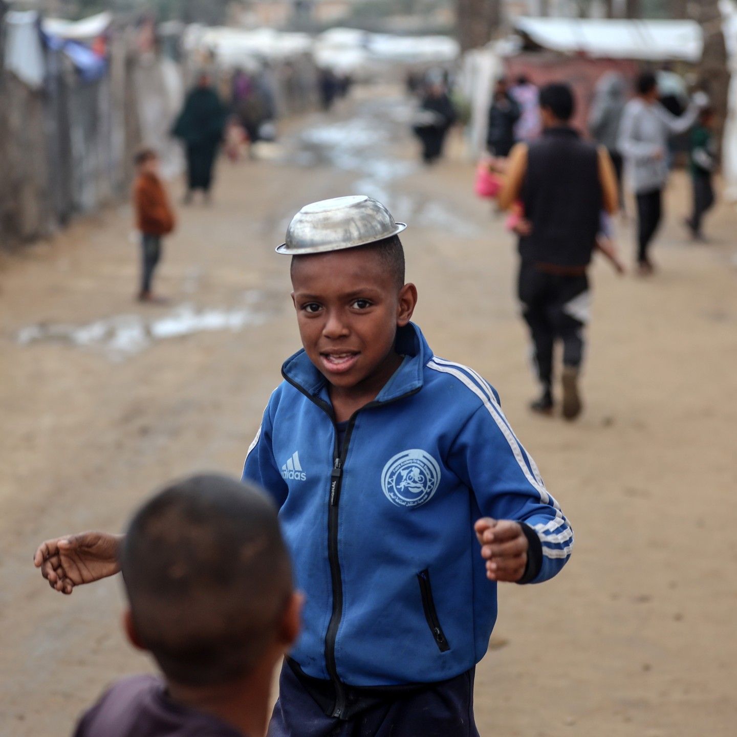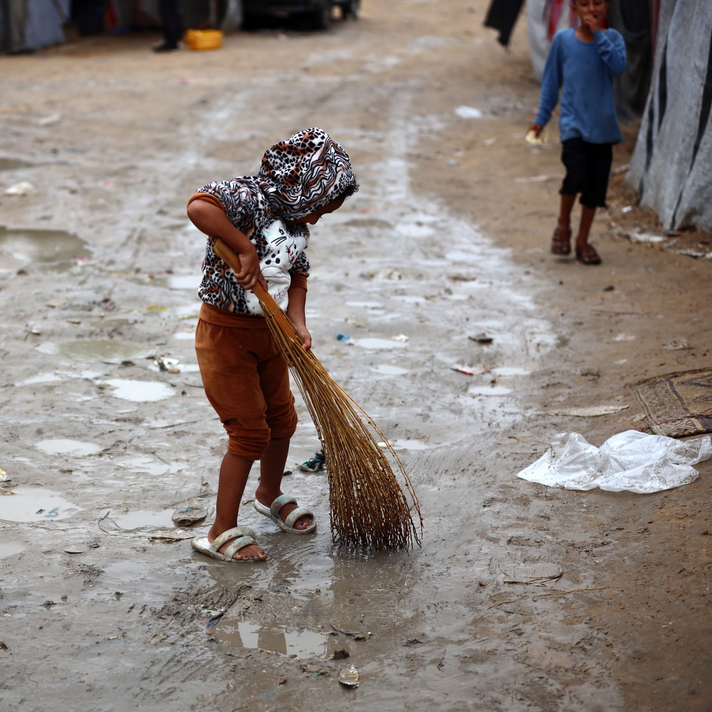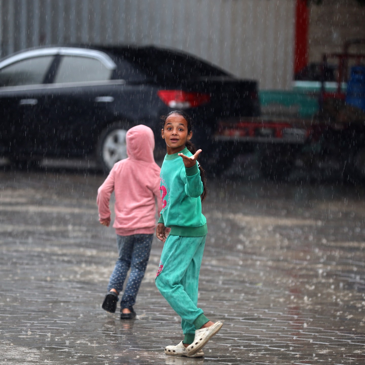 Displaced Palestinian children wait under the rain to provide water for their families in Gaza. أطفال ينتظرون تحت الأمطار للحصول على المياه لعائلاتهم النازحة في غزة
