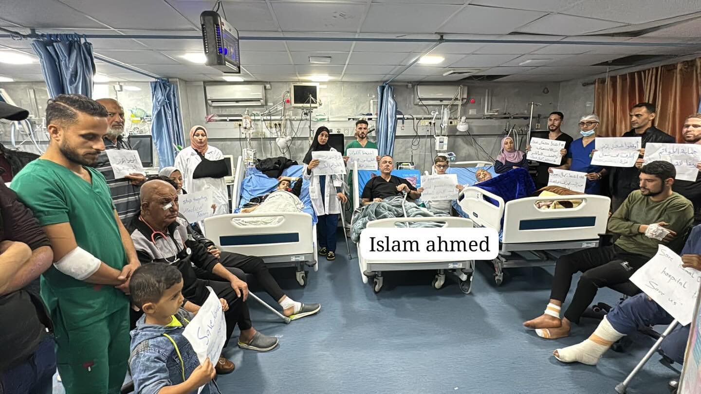A stand by the medical staff at Kamal Adwan Hospital in the northern part of the Gaza Strip, protesting the repeated targeting of the hospital and medical personnel, and calling on the international community to uphold its responsibility towards the healthcare system. # وقفة للطواقم الطبية بمستشفى كمال عدوان شمال القطاع، للتنديد بالاستهداف المتكرر للمستشفى والكوادر الطبية ، ولمطابلة المجتمع الدولي بالوقوف عند مسؤوليته اتجاه المنظومة الصحية