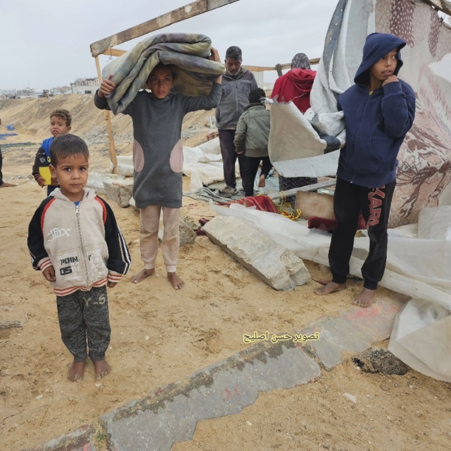 Palestinian children drag their belongings under the rain as they flee in Gaza. By @m.saed.gaza
