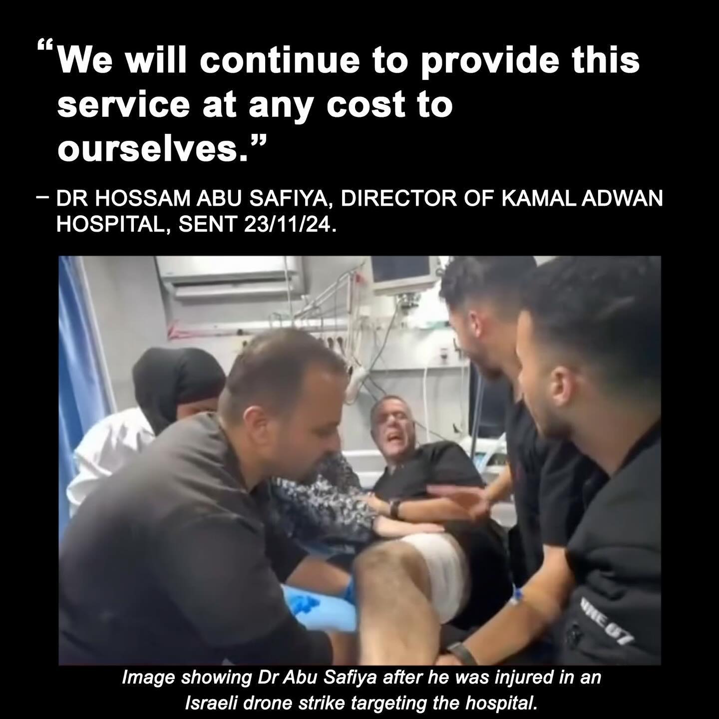 The health condition of Dr. Hossam Abu Safia, Director of Kamal Adwan Hospital, has deteriorated after being injured yesterday by an Israeli drone attack while working inside the hospital, according to medical sources. تدهور حالة الدكتور حسام أبو صفية مدير مستشفى كمال عدوان بعد إصابته بالأمس من طائرة “كواد كابتر” أثناء عمله داخل المشفى.