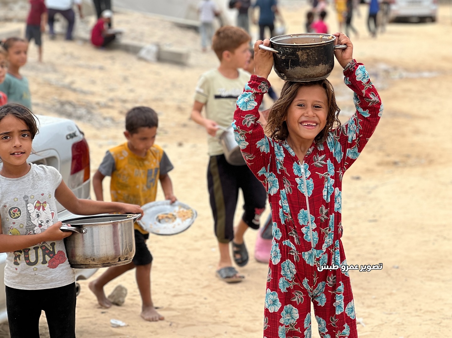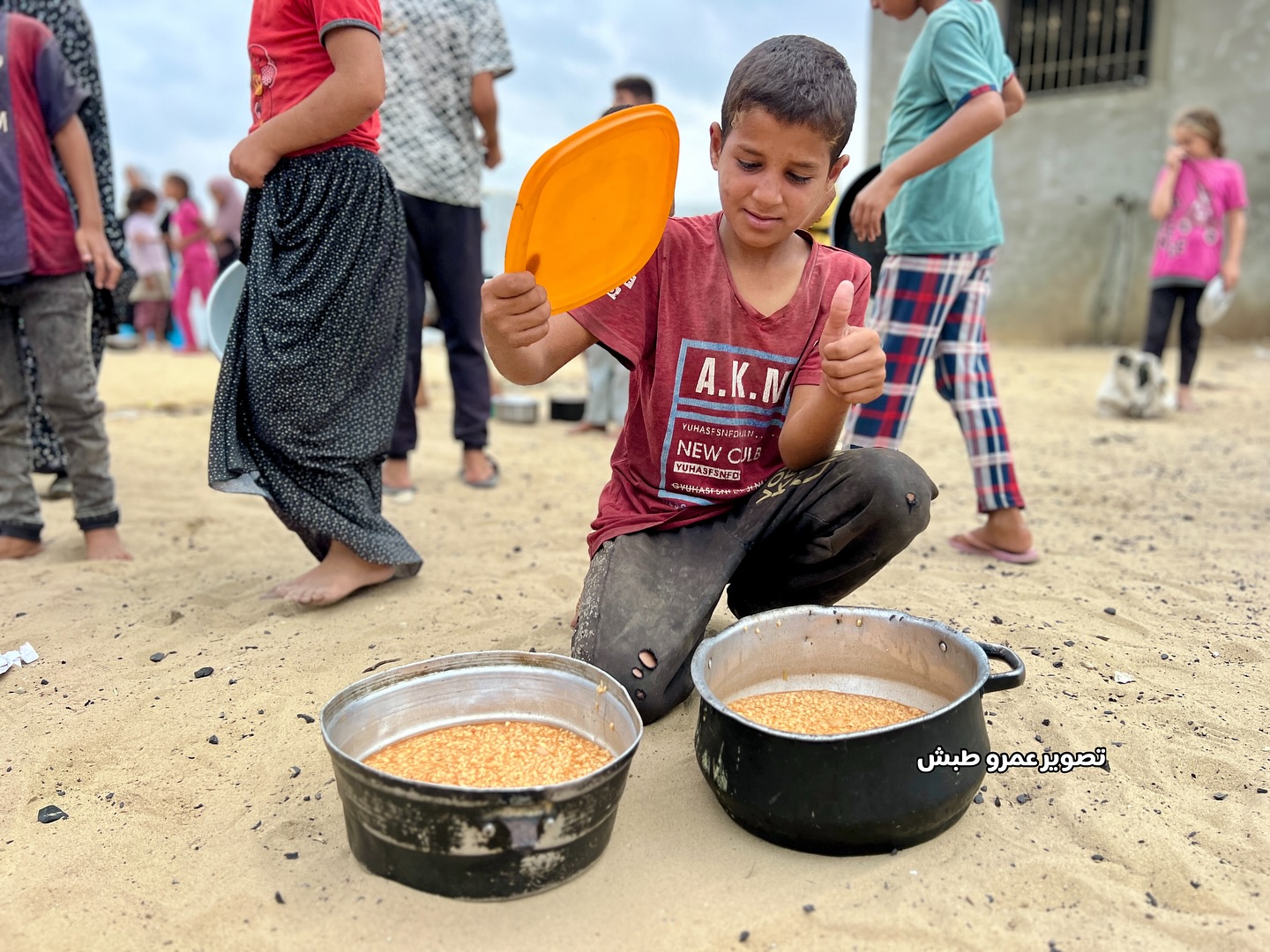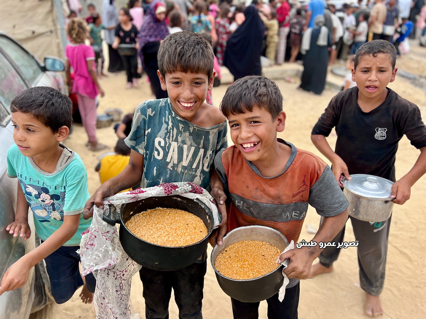 فرحة الأطفال بعد حصولهم على القليل من الطعام بعد انتظار دام أكثر من 5 ساعات Children’s joy after getting a little food after waiting for more than 5 hours