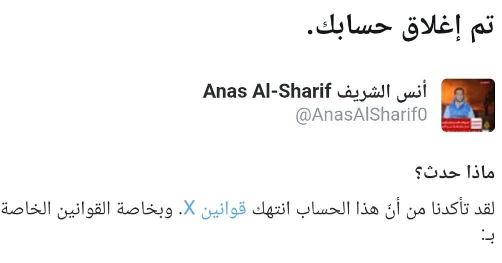منذ أيام، يتعرض حسابي على منصة X لسلسلة من البلاغات التي تهدف إلى إغلاقه وتقليل الوصول إلى المحتوى. إذا كانت هذه التغريدة قد وصلت إليكم، أرجو دعمها بالتفاعل: FOLLOW - Retweet - Like https://x.com/anasalsharif0/