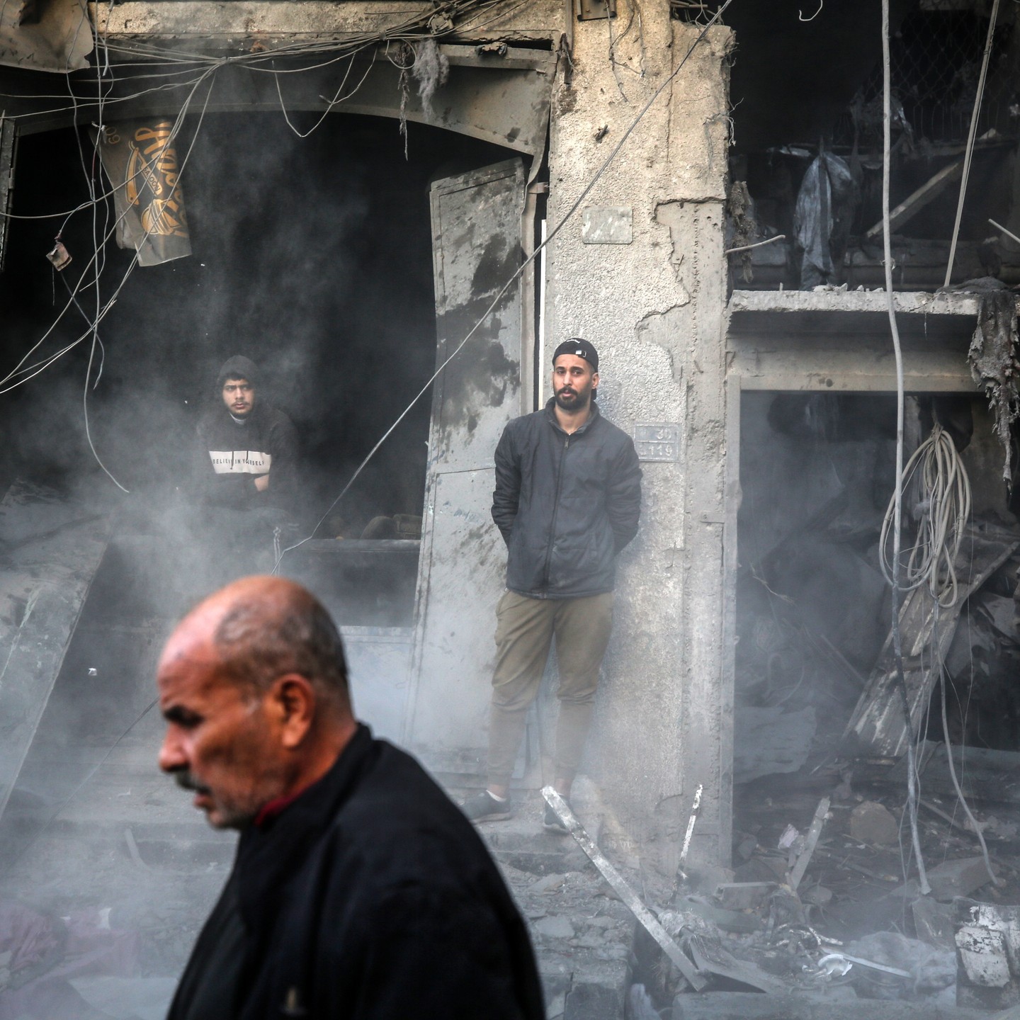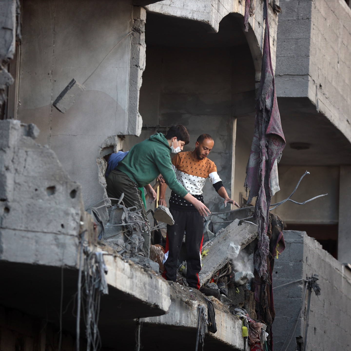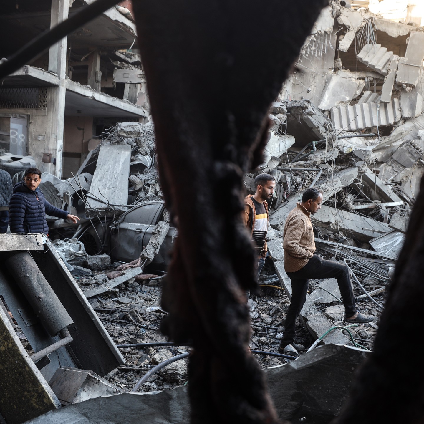 Palestinian residents of the area inspect the targeted building and surrounding structures that sustained damage after Israeli attack on Nuseirat Refugee Camp in Gaza City, Gaza on December 13, 2024. The death toll from an Israeli airstrike on the Nuseirat refugee camp has risen to 33, with 84 others injured and missing, the Gaza-based Government Media Office said. (Photo by Ali Jadallah/Anadolu via Getty Images)