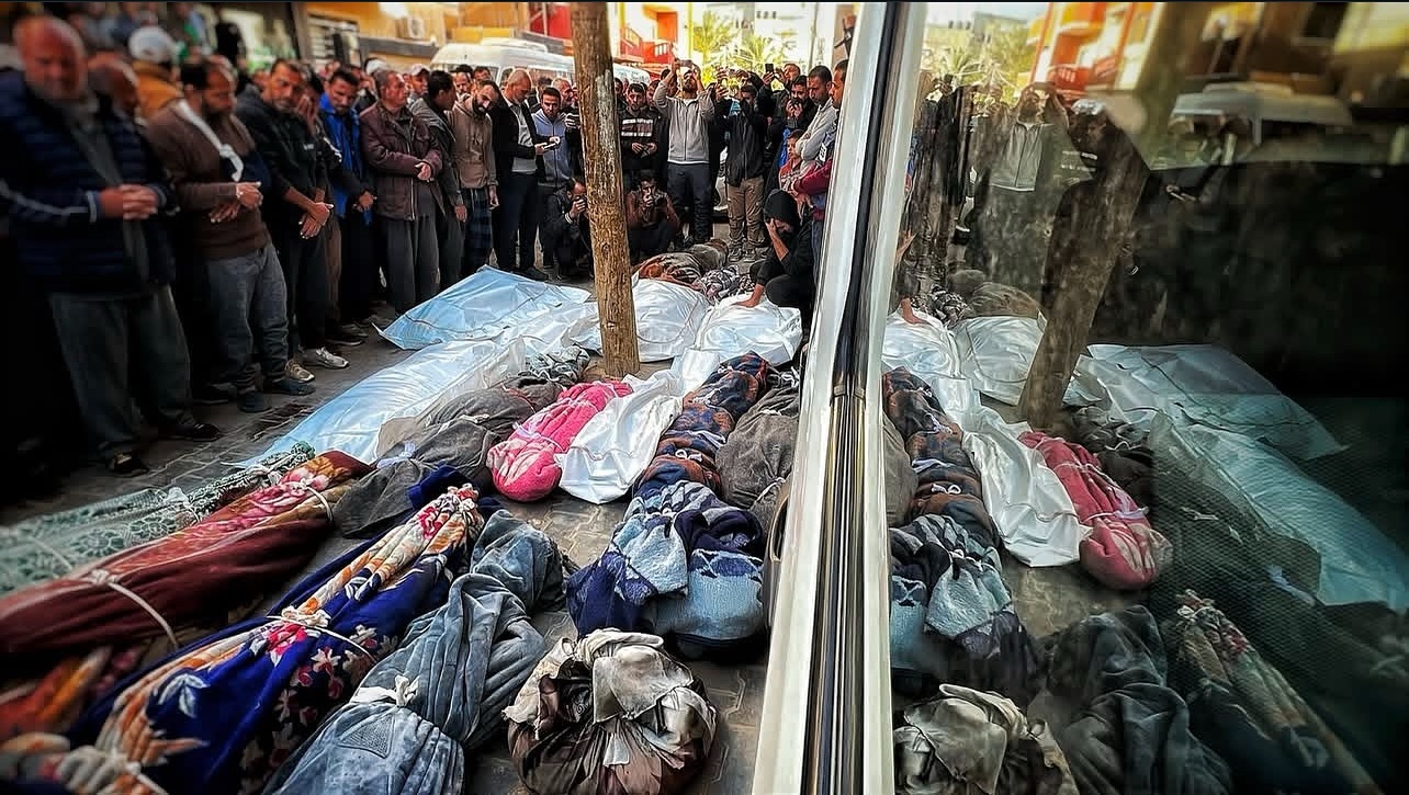 جنازة عشرات الشهداء من مجزرة النصيرات التي قتلت أكثر من ٣٥ شهيد بينهم ١٢ طفلا . مستشفى العودة . مخيم النصيرات Funeral of dozens of martyrs from massacre in Nusairat refugee camp, that killed more than 35 person including 12 children