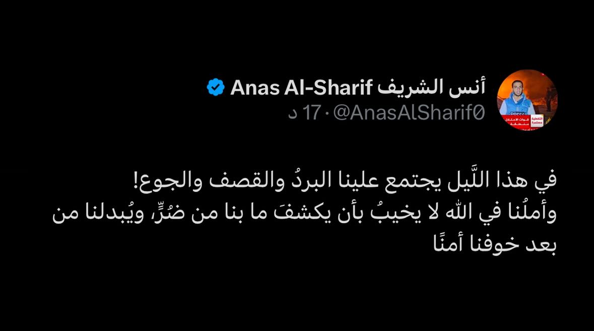 في هذا اللَّيل يجتمع علينا البردُ والقصف والجوع! وأملُنا في الله لا يخيبُ بأن يكشفَ ما بنا من ضُرٍّ، ويُبدلنا من بعد خوفنا أمنًا