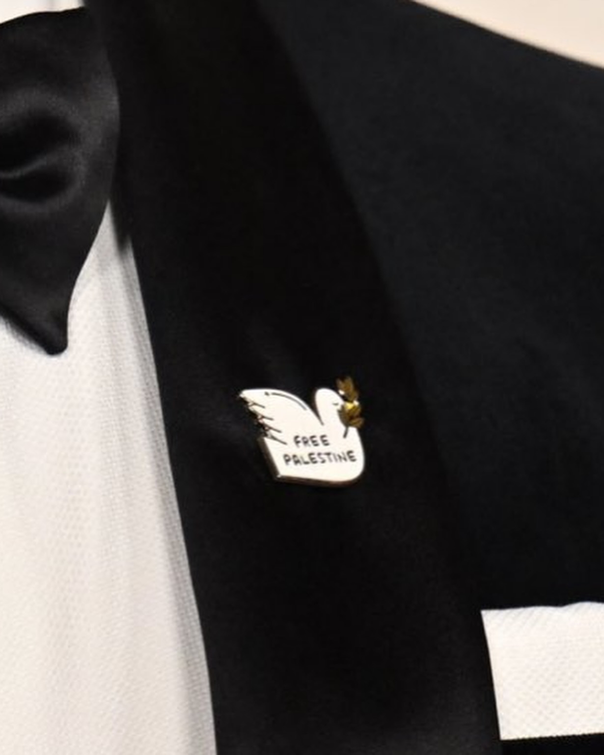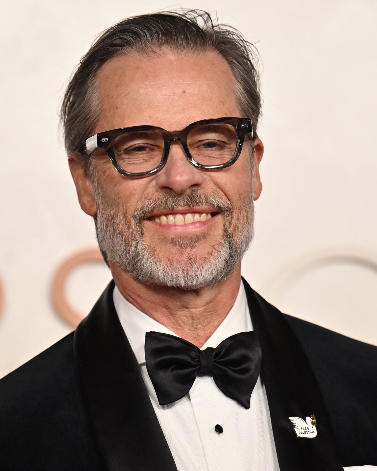 The #Australian actor Guy Pearce wears a #FreePalestine pin at the #Oscars . الممثل الأسترالي جاي بيرس يرتدي دبوس «فلسطين حرة» خلال حفل الأوسكار