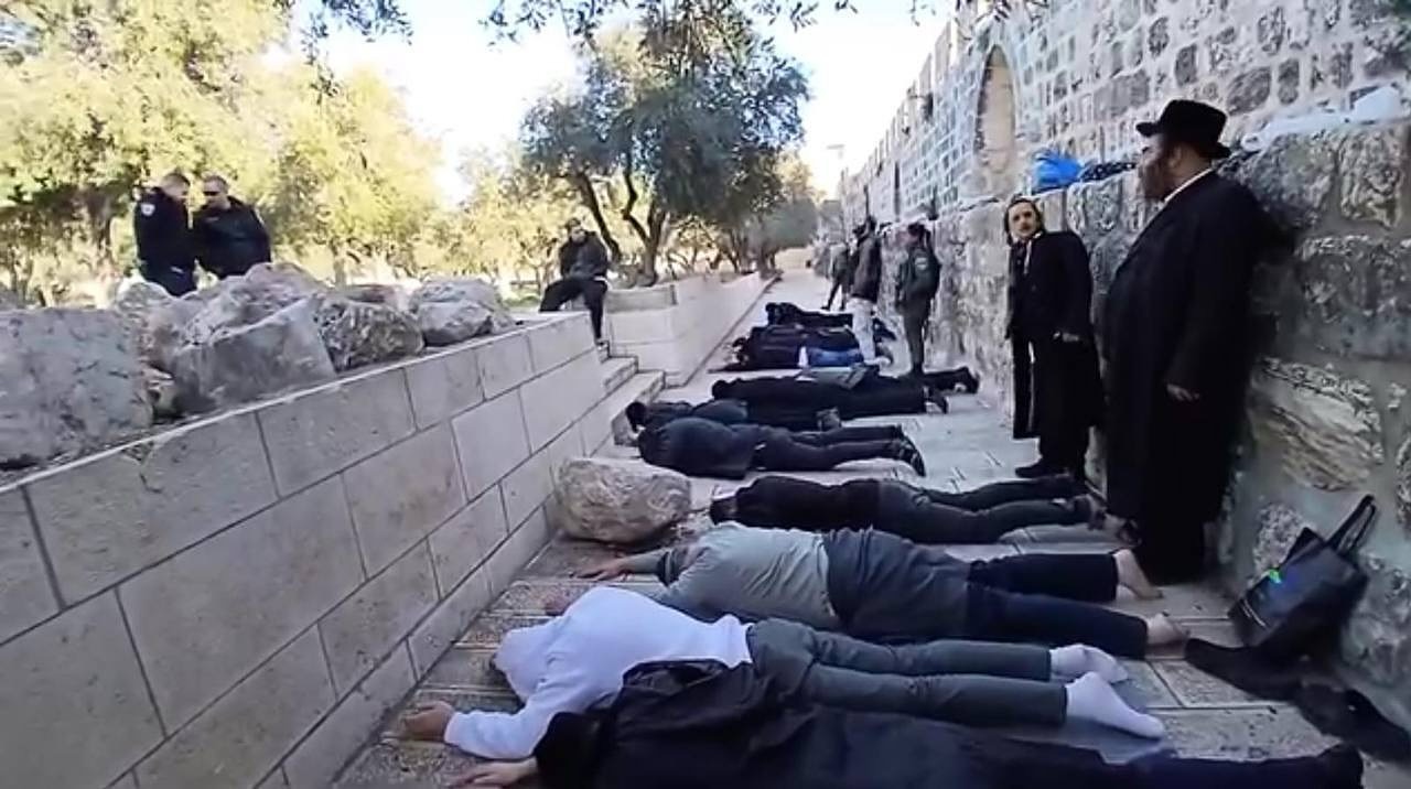 Israeli settlers perform the so-called epic prostration during their incursion into the courtyards of Al-Aqsa Mosque in occupied Jerusalem. مستوطنون يؤدون ما يسمى بالسجود الملحمي خلال اقتحام المسجد الأقصى المبارك،