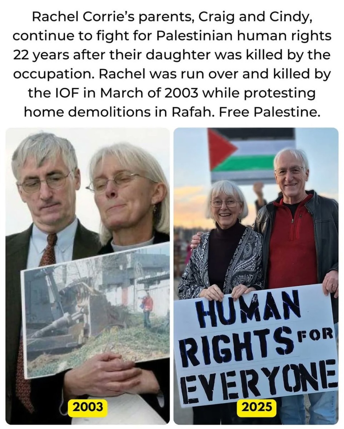 The parents of Rachel Corrie continue to protest for Palestine 22 years after Israel killed their daughter.
