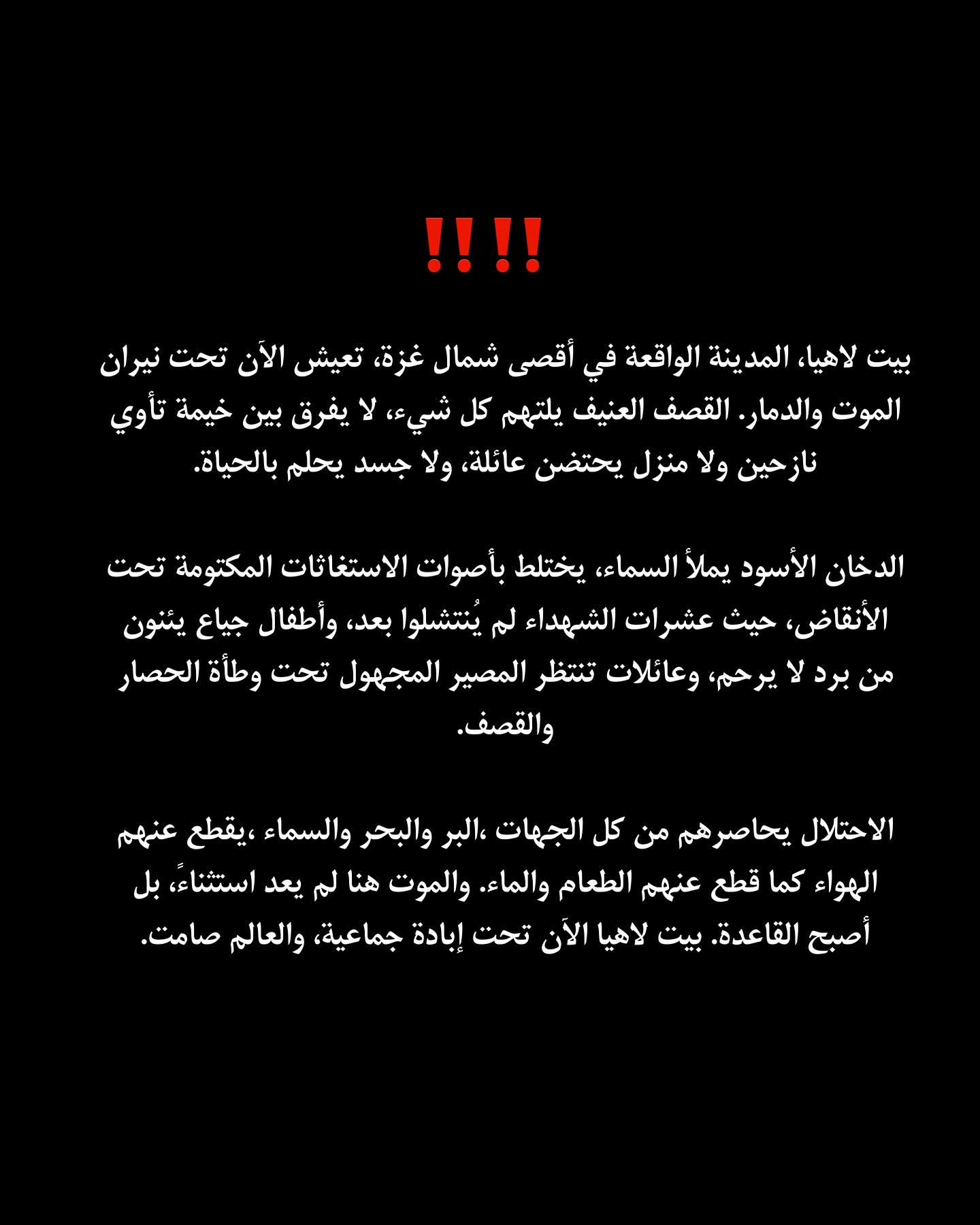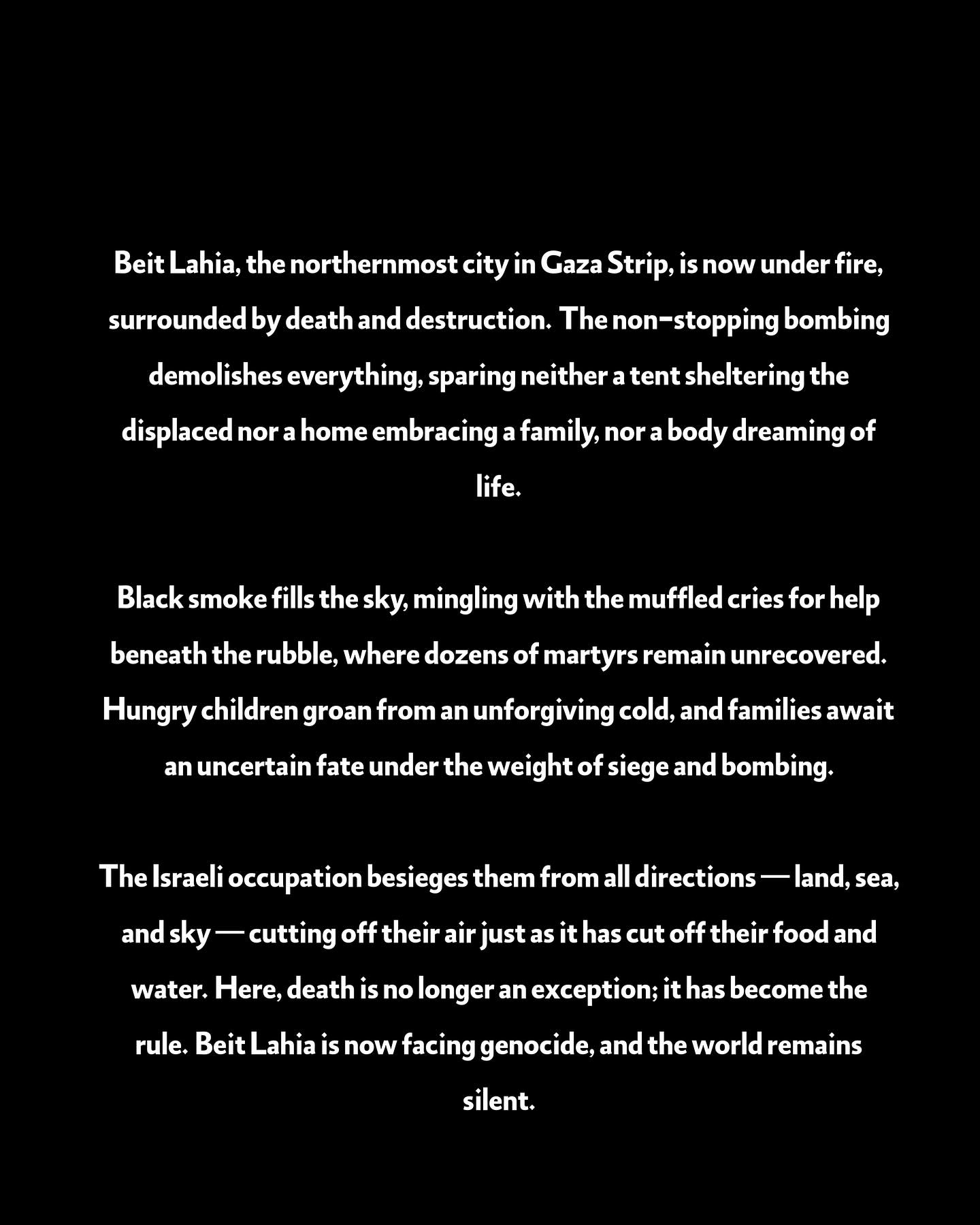 بيت لاهيا، المدينة الواقعة في أقصى شمال غزة، تعيش الآن تحت نيران الموت والدمار. القصف العنيف يلتهم كل شيء، لا يفرق بين خيمة تأوي نازحين ولا منزل يحتضن عائلة، ولا جسد يحلم بالحياة. الدخان الأسود يملأ السماء، يختلط بأصوات الاستغاثات المكتومة تحت الأنقاض، حيث عشرات الشهداء لم يُنتشلوا بعد، وأطفال جياع يئنون من برد لا يرحم، وعائلات تنتظر المصير المجهول تحت وطأة الحصار والقصف. الاحتلال يحاصرهم من كل الجهات ،البر والبحر والسماء ،يقطع عنهم الهواء كما قطع عنهم الطعام والماء. والموت هنا لم يعد استثناءً، بل أصبح القاعدة. بيت لاهيا الآن تحت إبادة جماعية، والعالم صامت.