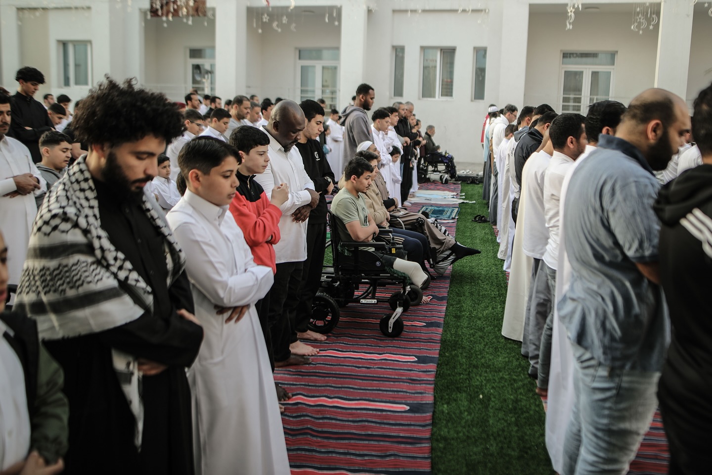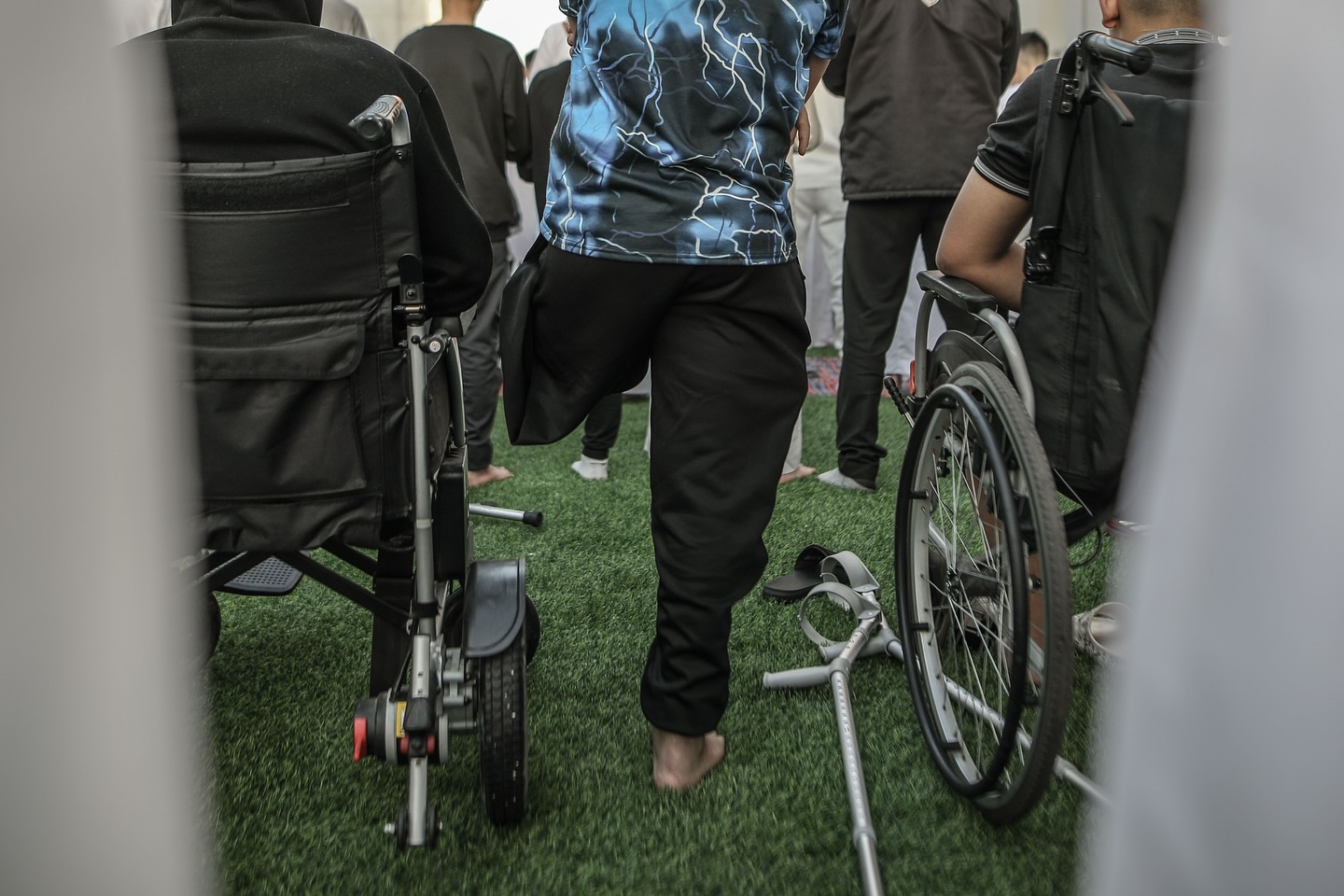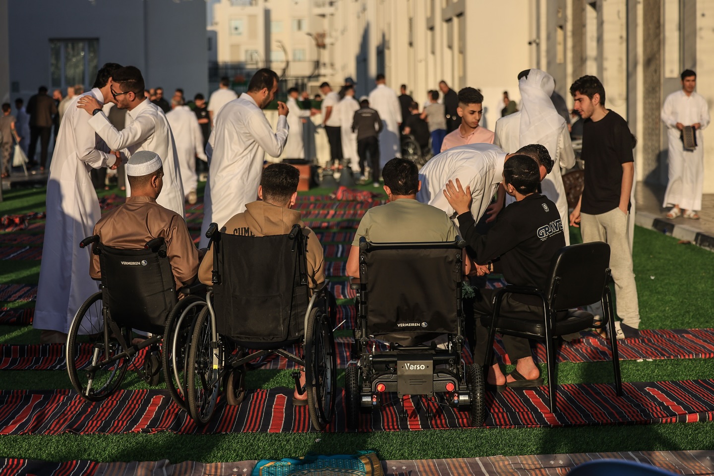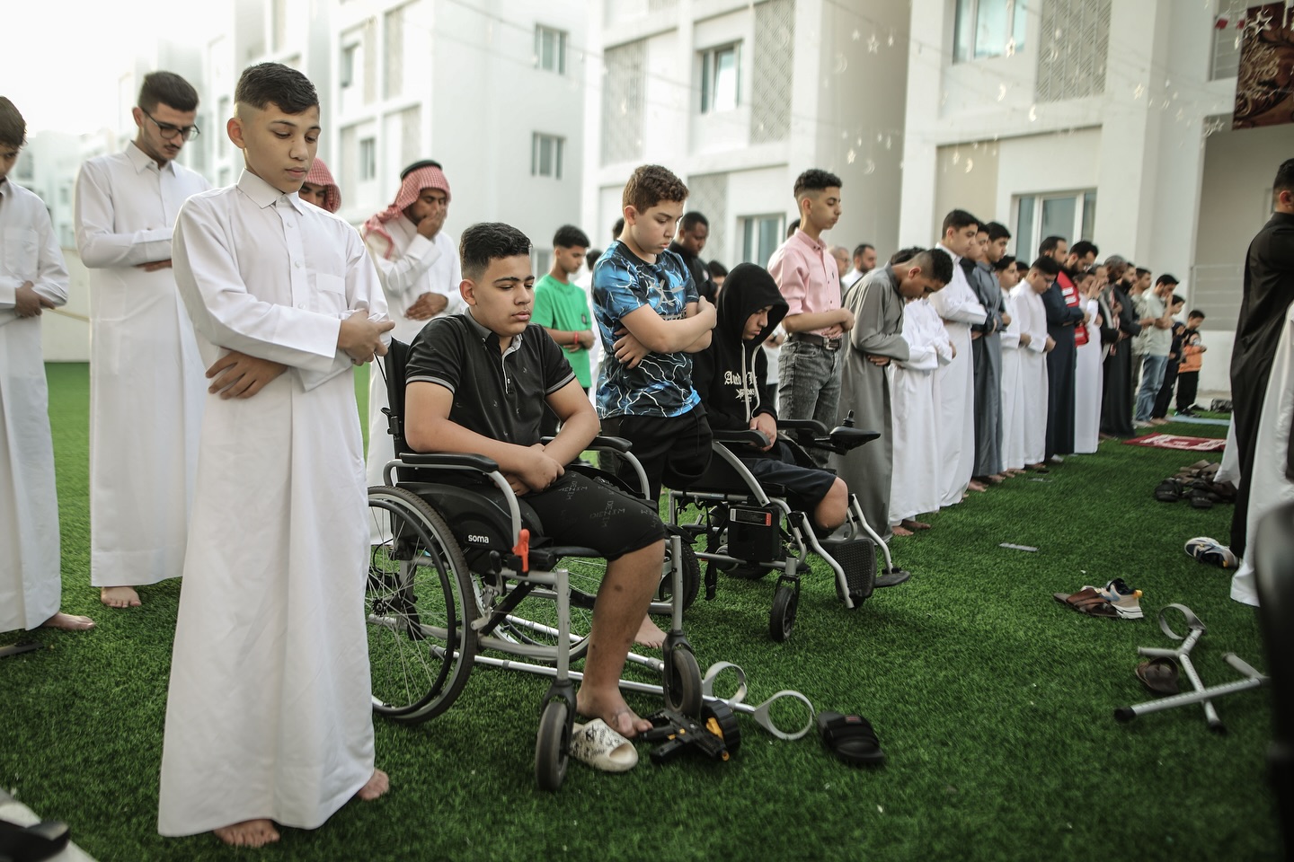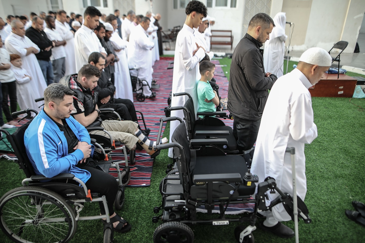 Dozens of wounded Palestinians with amputated limbs performed Eid prayers at Al-Thumama Complex in Doha Photo:Belal Khaled