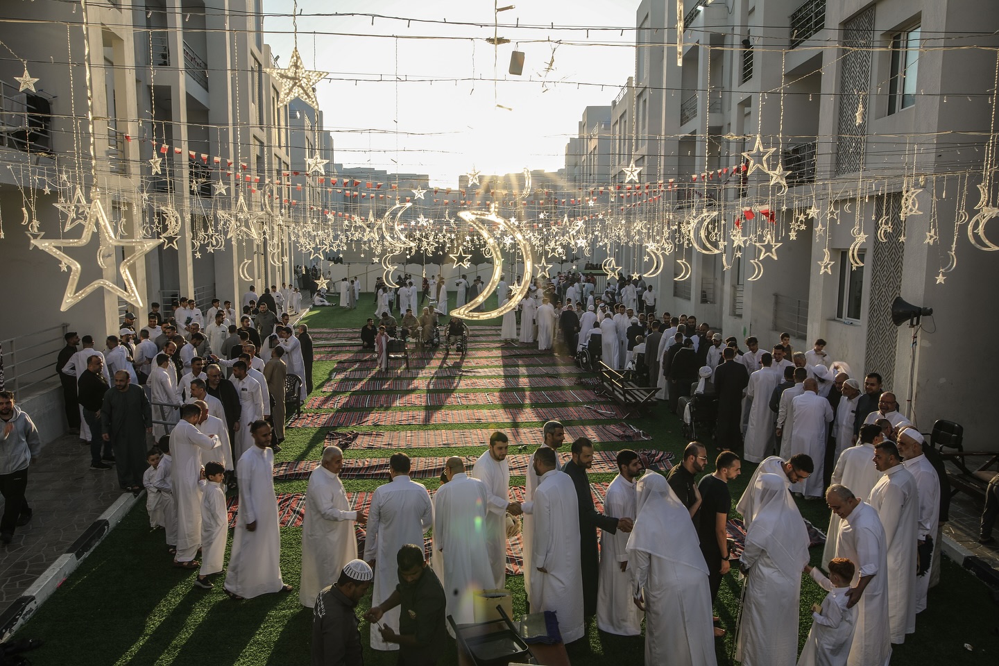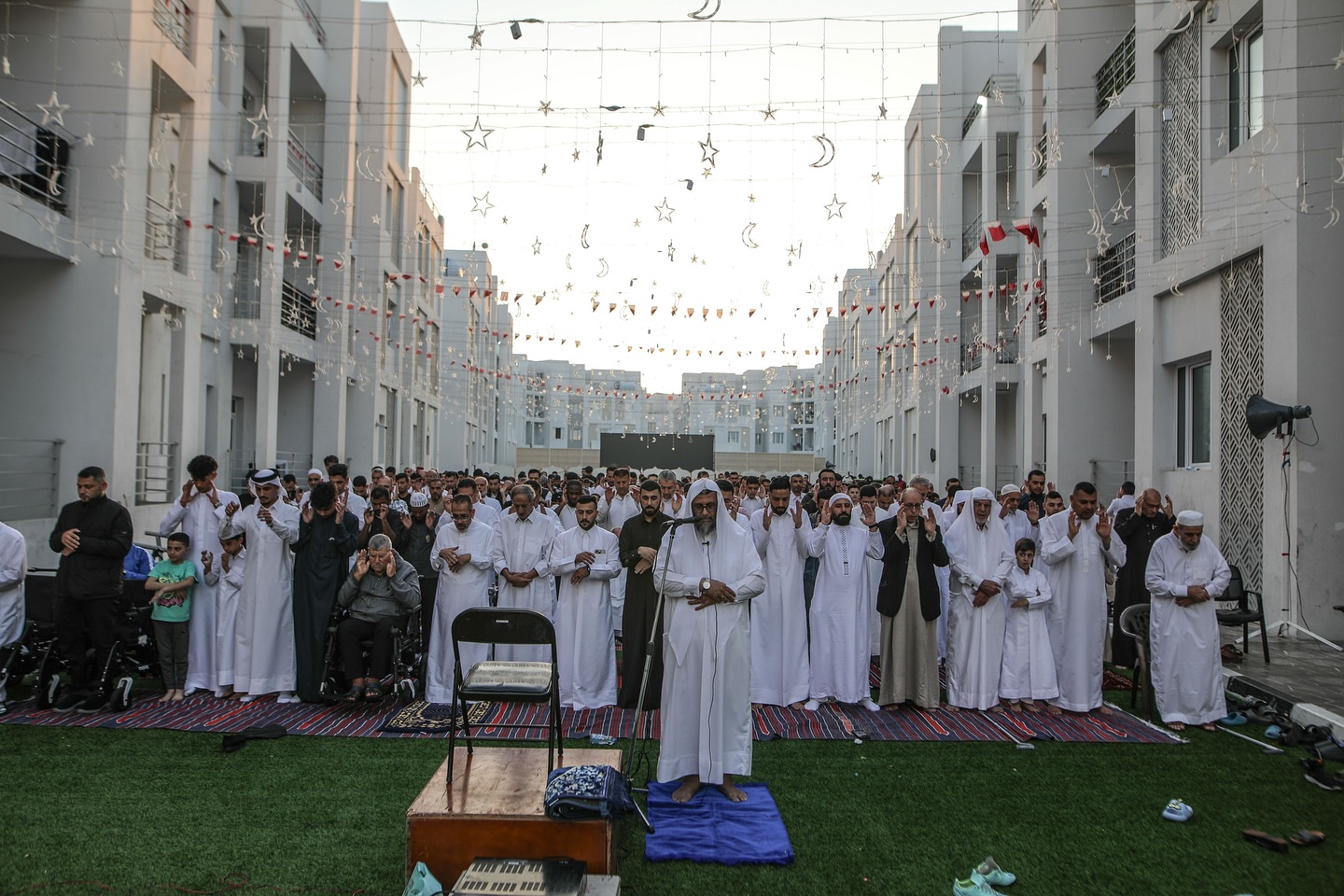 Palestinians perform Eid prayers at a school housing displaced people in Khan Yunis, south of the Gaza Strip.
