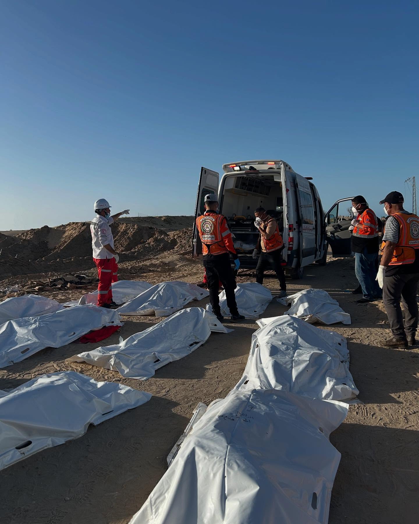Today the Palestinian Red Crescent Society recovered the bodies of 8 of its medics in Rafah, along with 6 members of the civil defence and one member of UN staff. The Gaza Ministry of Health says “some of these bodies were bound and shot in the chest. They were buried in a deep hole to prevent their identification.”