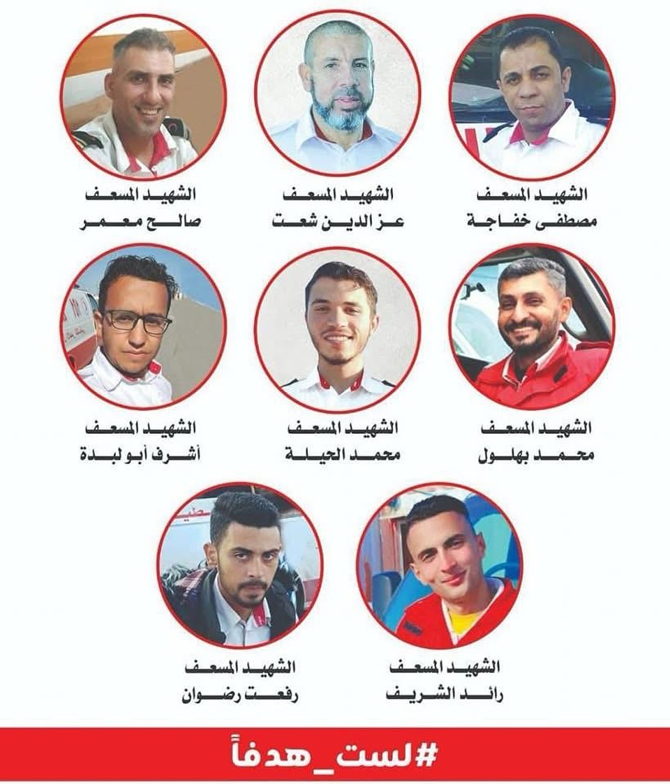 They went in a mission to rescue the wounded and besieged civilians in Tal Al-Sulatan neighborhood in Rafah city, after they got a call for help, but they didn’t return! Today they found their bodies after being missed for 7 days, they were handcuffed and executed by the Israeli occupation forces. Israeli occupation forces killed 13 members of Red Crescent and civil defense crews.