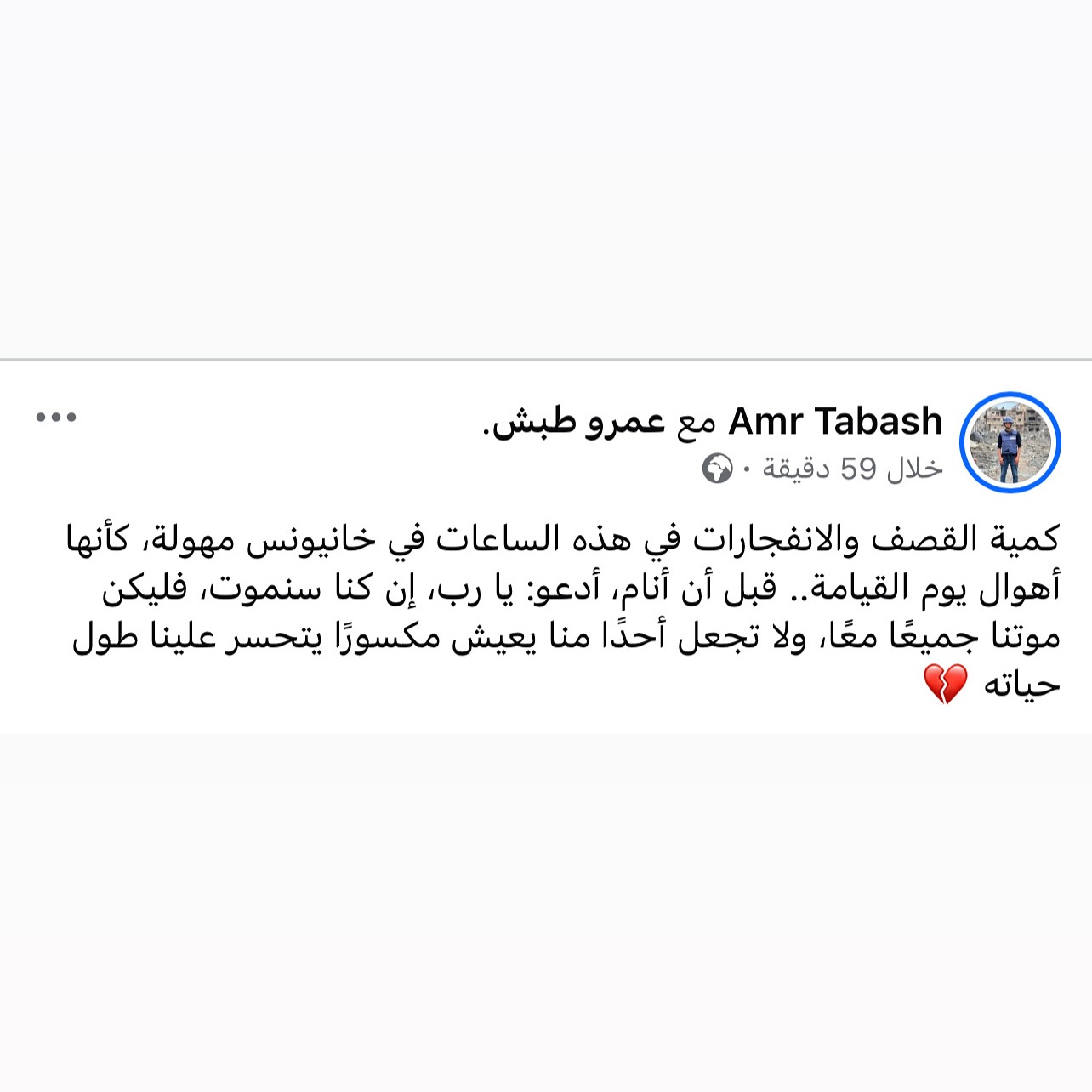 كمية القصف والانفجارات في هذه الساعات في خانيونس مهولة، كأنها أهوال يوم القيامة.. قبل أن أنام، أدعو: يا رب، إن كنا سنموت، فليكن موتنا جميعًا معًا، ولا تجعل أحدًا منا يعيش مكسورًا يتحسر علينا طول حياته 💔