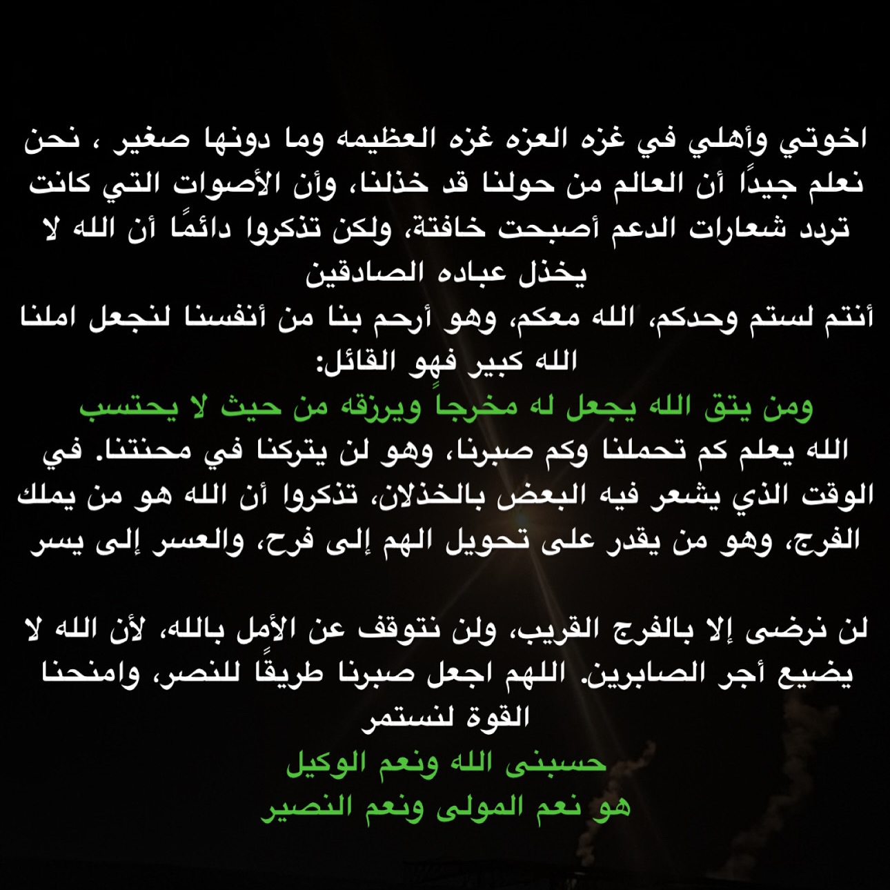 ف سامحوني ازا كان هذا هو يوم ميلادي الاخير ، لم اضع صورة وخلفي المنازل المدمرة ولبسي غير مرتب ، لا اريد من احد الشفقة فمظهري جميل ، اريد عندما تذكروني ان تتذكروني بشخصيتي القديمة ، عبدالله الذي كان يحب الحياة ، الذي كان يصنع الحياة ، اللهم اجعل ايامي كلها في طاعتك الله استخدمني ولا تستبدلني🖤❤️🖤