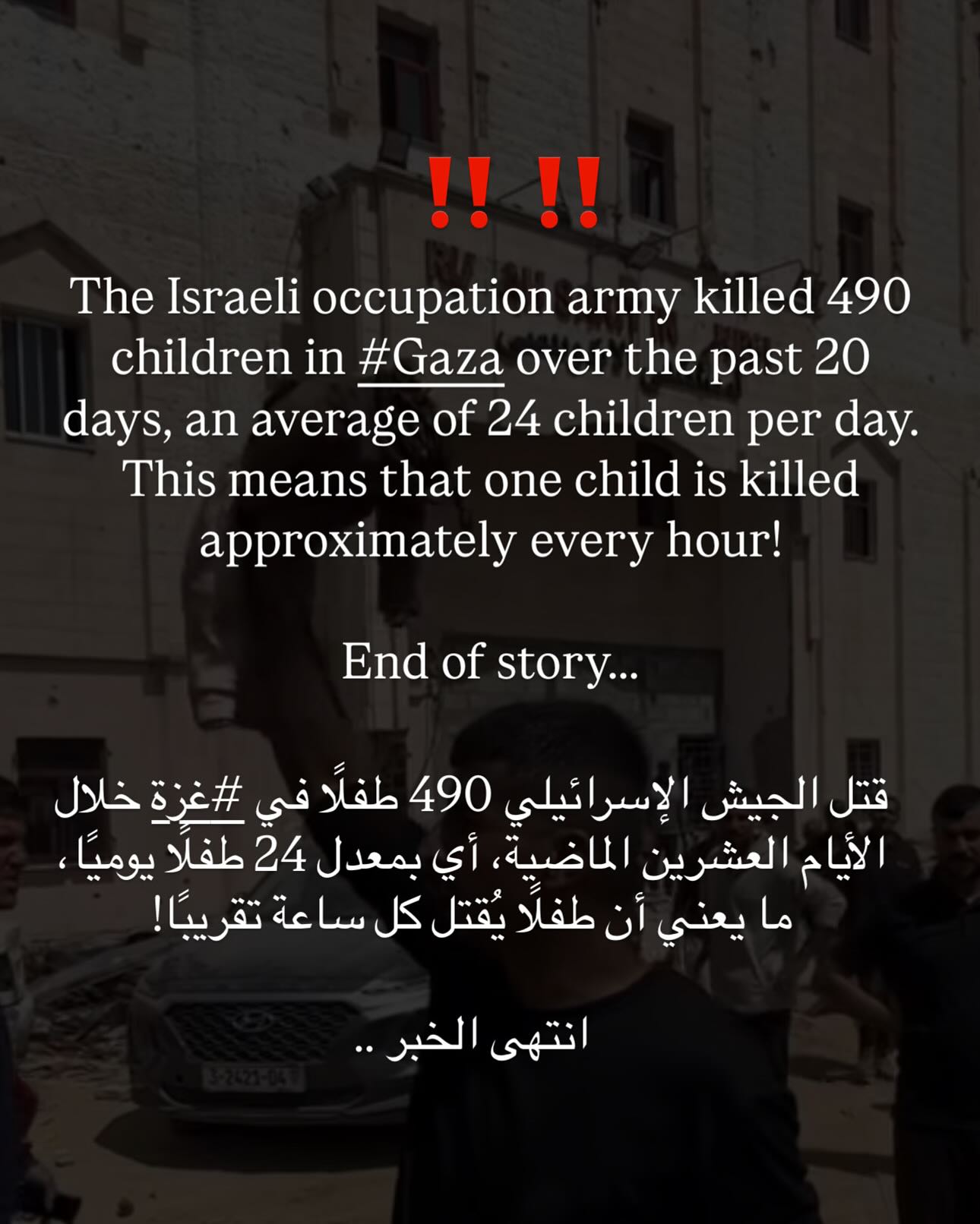 قتل جيش الاحتلال الإسرائيلي 490 طفلًا في #غزة خلال الأيام العشرين الماضية، أي بمعدل 24 طفلًا يوميًا، ما يعني أن طفلًا يُقتل كل ساعة تقريبًا! انتهى الخبر ..