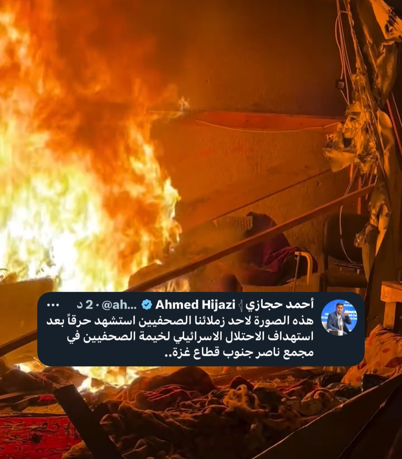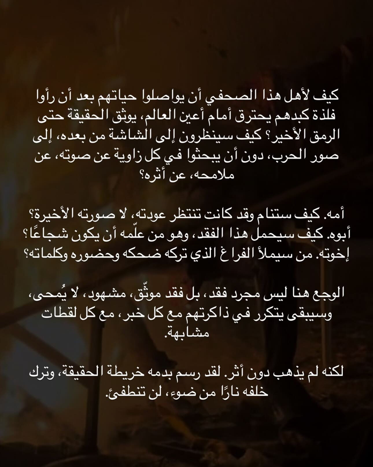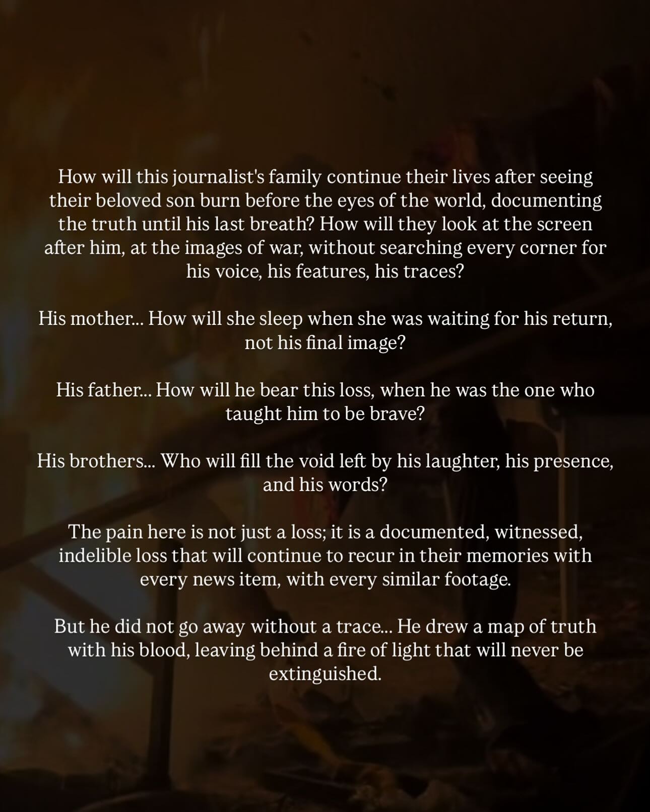 In Gaza, we have tasted every form of death. 2:47 AM @mohamed.h.masri How will this journalist's family continue their lives after seeing their beloved son burn before the eyes of the world, documenting the truth until his last breath? How will they look at the screen after him, at the images of war, without searching every corner for his voice, his features, his traces?