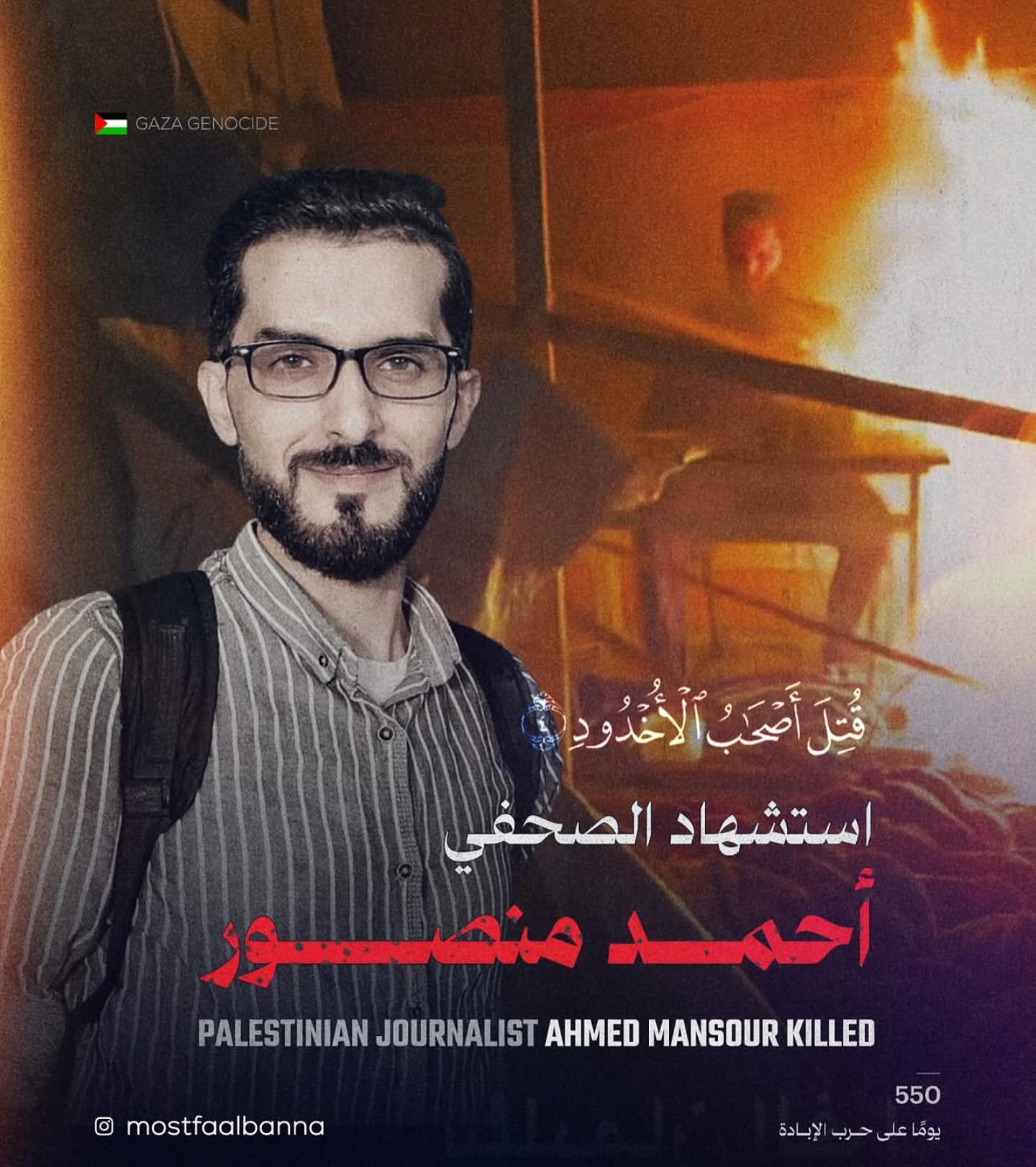 استشهاد الزميل الصحفي أحمد منصور متأثراً بإصابته جراء قصف الاحتلال خيمة صحفيين بمستشفى ناصر في خانيونس
