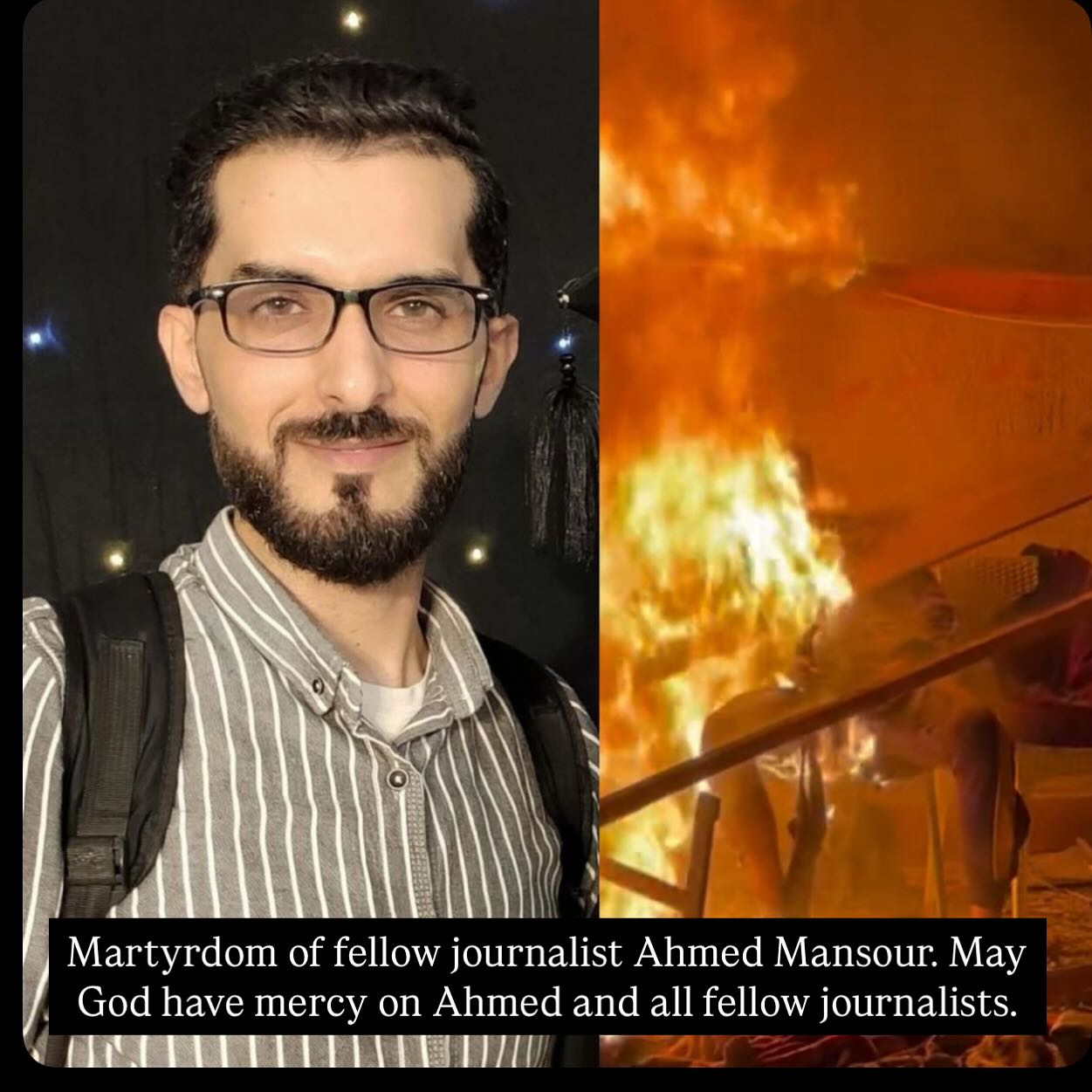 لن ننساك يا أحمد ولن ننسى جريمتهم البشعة بحقك ما حيينا. وداعًا يا شهيد الكلمة. استشهد قبل قليل زميلنا الصحفي أحمد منصور متأثرًا بإصابته الحرجة جدًا، جراء القصف الإسرائيلي الذي استهدف خيام الصحفيين في غزة رحمه الله وأسكنه فسيح جناته وألهم عائلته الصبر والسلوان