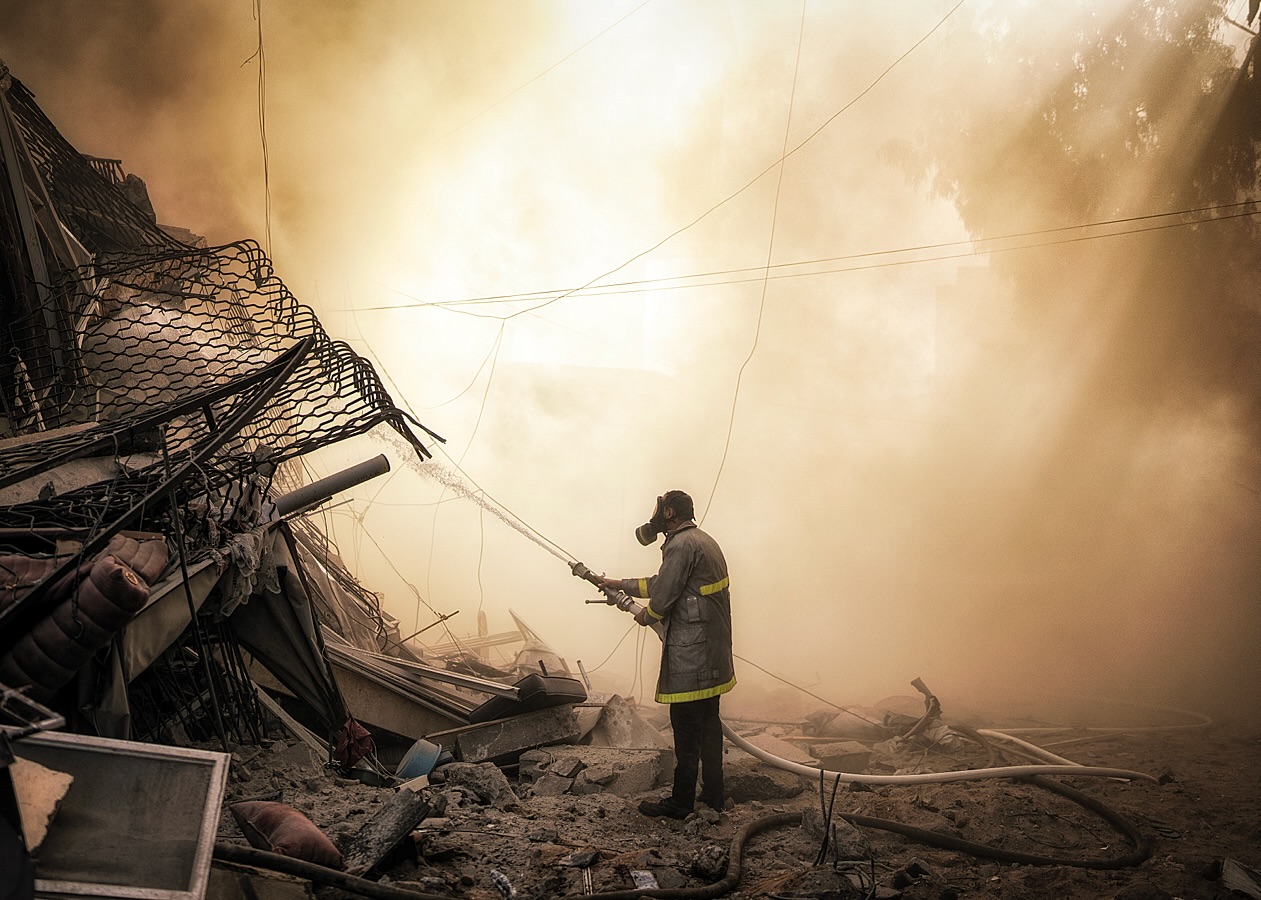 Palestinian fireman is trying to put out a fire caused by an Israeli air strike that destroyed a residential tower in Gaza city. A lot of times there was no water or even fire trucks to control the fire that caused by Israeli air strikes, As Israeli occupation destroyed most of civil defense crafts and stations. Photo by Motaz Azaiza.