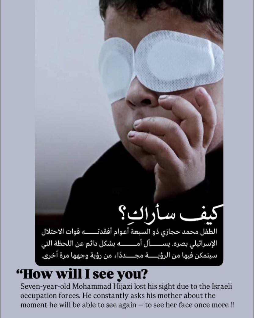 “How will I see you? Seven-year-old Mohammad Hijazi lost his sight due to the Israeli army. He constantly asks his mother about the moment he will be able to see again - to see her face once more!!