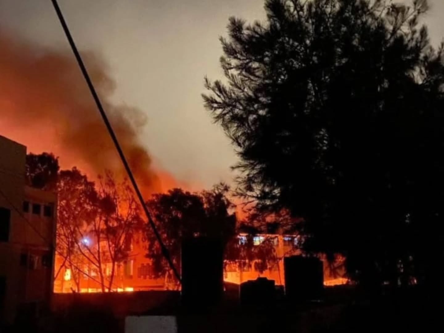 Fire broke out in the tents of displaced Palestinians at Yaffa School in Al-Tuffah neighborhood, east of Gaza City. اشتعال النيران في خيام النازحين بعد قصفها في مدرسة يافا بحي التفاح شرق مدينة غزة.
